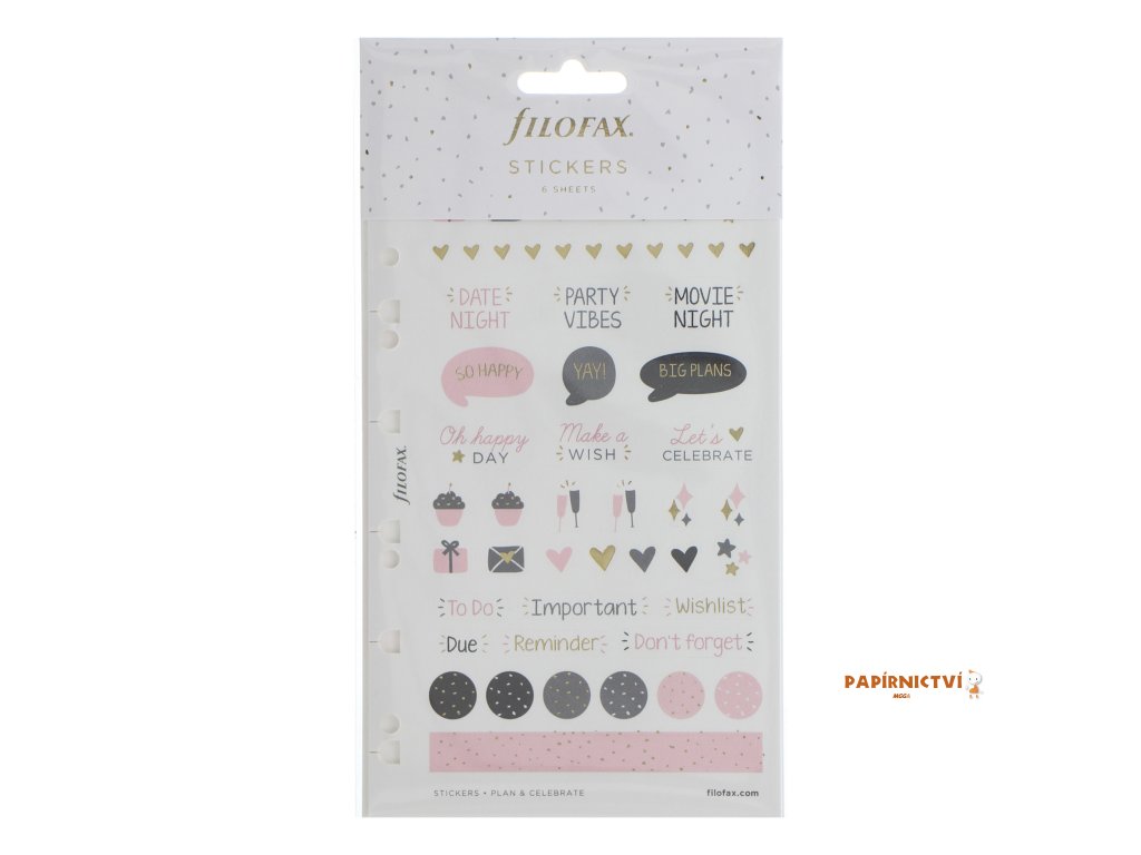 Stránky Vašeho diáře či zápisníku zasypete přívalem radosti díky samolepkám z kolekce Coffetti. Samolepky můžete přelepovat a mají matný povrch, takže na ně můžete jednoduše psát. Tato sada byla speciálně navržena tak, aby doplnila Váš diář či Clipbook ve velikostech A5 nebo Osobní a také zápisník Filofax Notebook A5. Sada samolepek obsahuje: 2 listy dekorativních samolepek, 2 listy funkčních samolepek, 2 listy plánovacích samolepek. To všechno v barevném provedení kolekce Confetti černá, růžová, bílá a šedá s detaily ze zlaté fólie.Další vlastnosti
