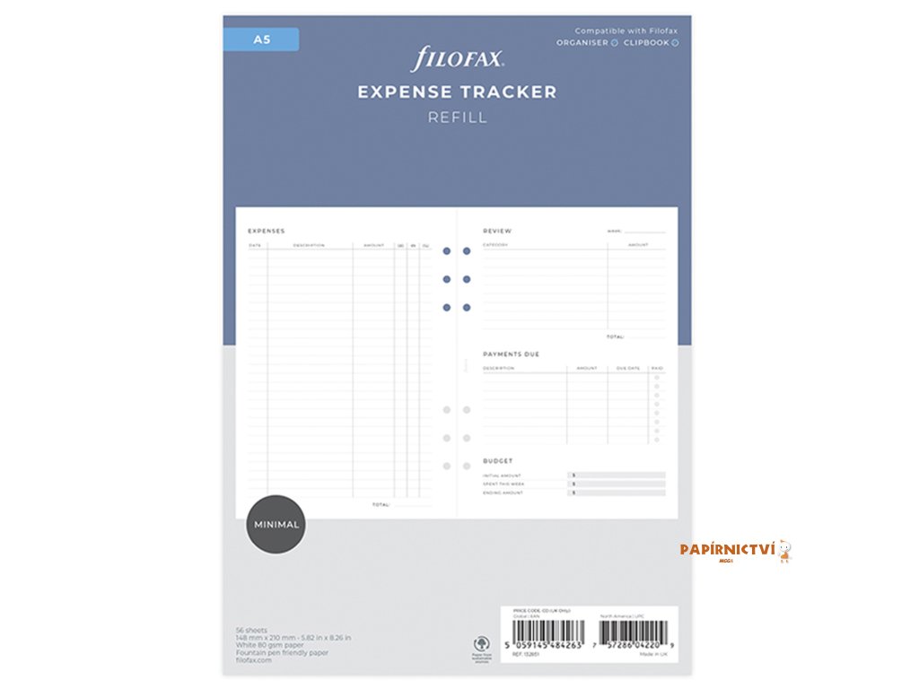 Vždy je velice důležité precizně sledovat vlastní finance. S naší náplní Sledování výdajů to bude hračka. Je navržená ve stylu Minimal a má týdenní rozložení s možností připomínek. Můžete si sledovat úspory, výdaje i splácení dluhů. To všechno vám zjednoduší a zpřehlední vaše výdaje. Papír je vhodný pro plnicí pera - 80 g/m2. Kompatibilní s diáři Filofax velikosti A5 a Clipbook velikosti A5.Další vlastnosti