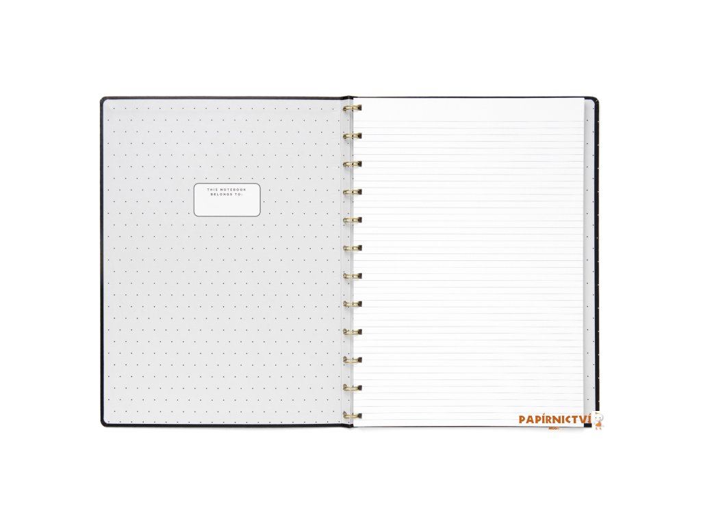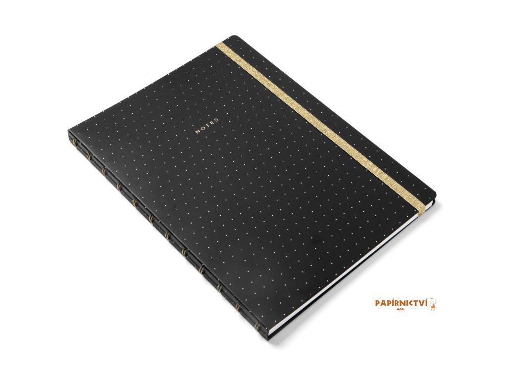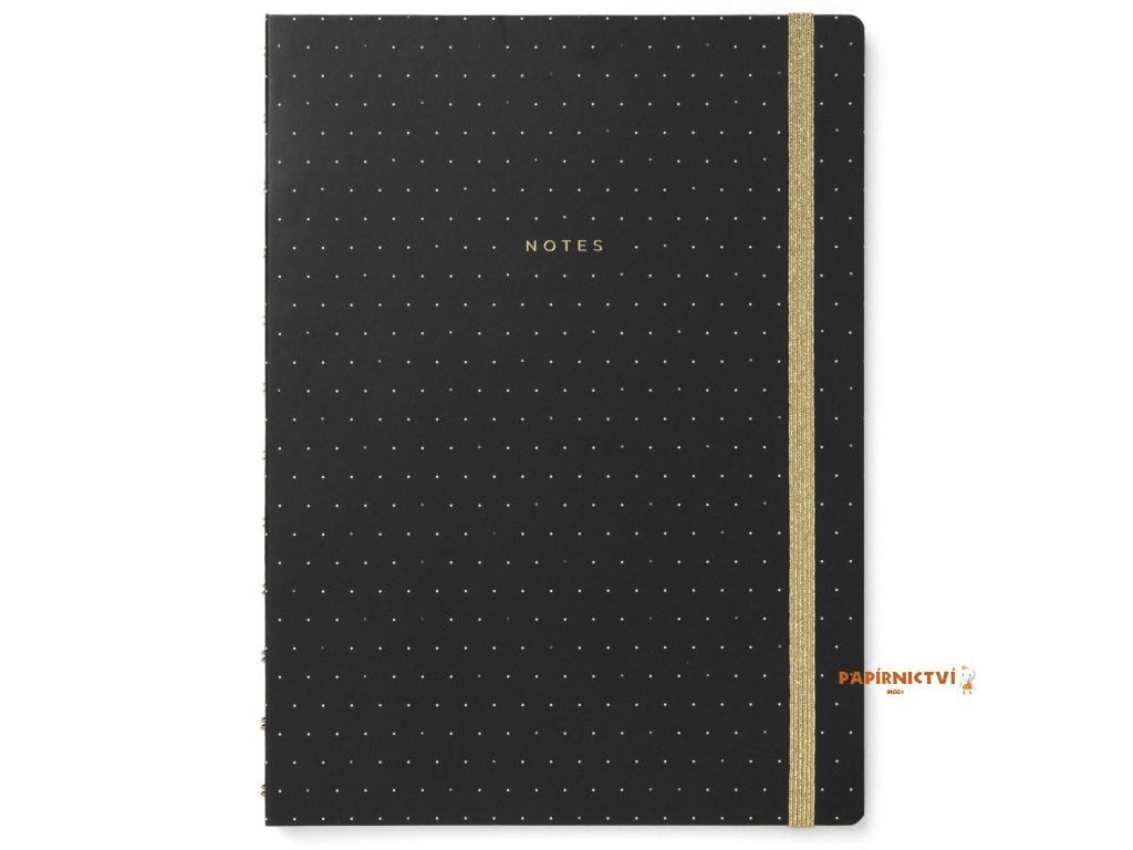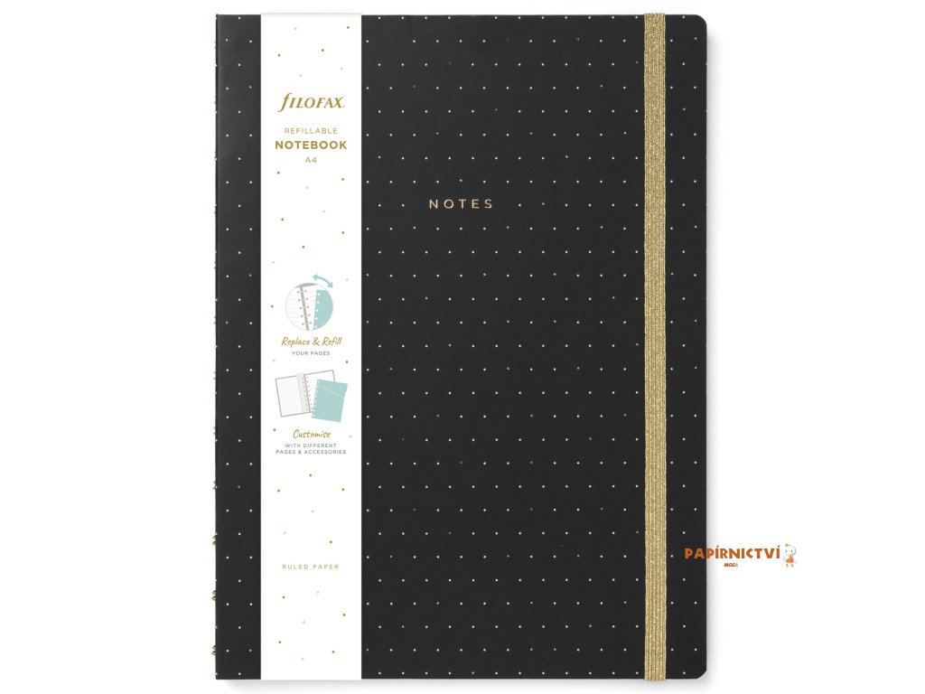 Vaše poznámky a myšlenky budou jenom zářit v tomto znovu plnitelném zápisníku Filofax Notebook A4 v černé barvě z kolekce Moonlight, kterou zdobí zlaté detaily vzorovaná vnitřní strana desek v kontrastních barvách. Zápisník obsahuje linkovaný papír vhodný pro plnicí pero, který lze přemístit a nebo doplnit. Jeho zlatá dvoudrátová vazba umožňuje zápisníku ležet naplocho a barevně ladící gumička na zavírání vám pomůže udržet vše na jednom místě. Minimalistický, ale okouzlující styl.Obsah