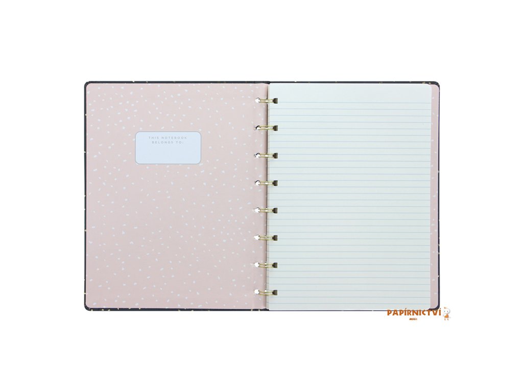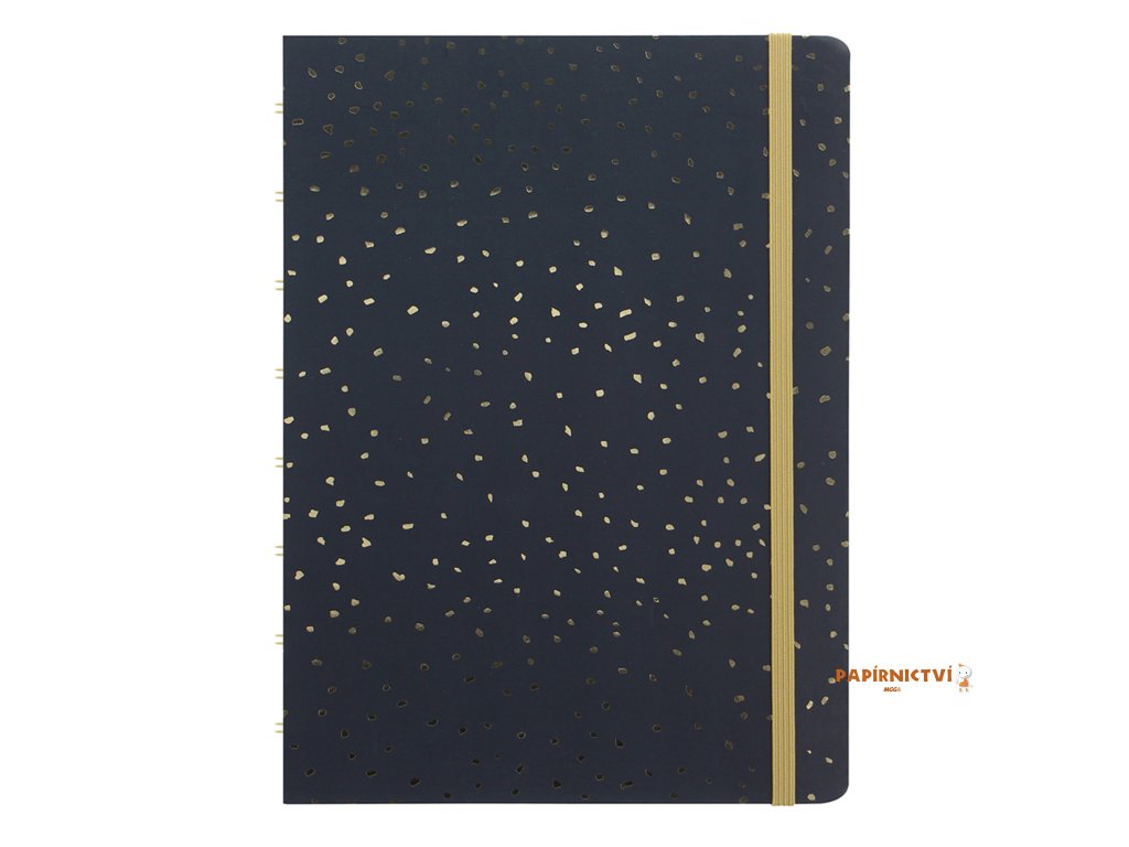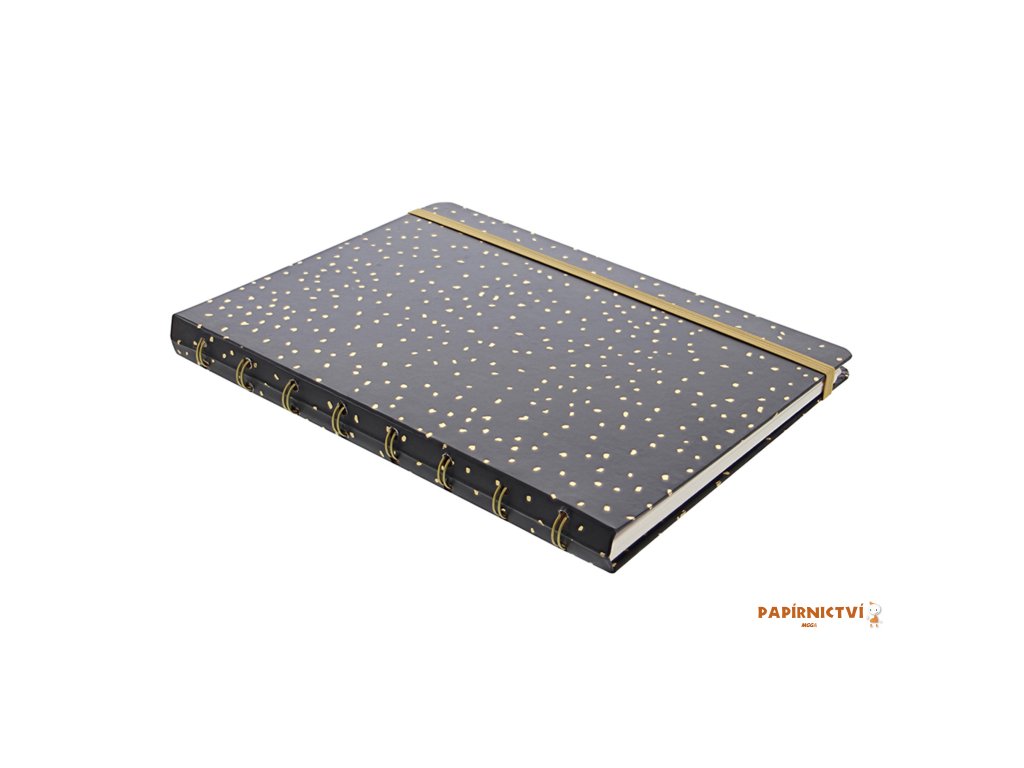 S tímto plnitelným zápisníkem Filofax Notebookem A5 z naší kolekce Confetti v provedení Charcoal bude každý Váš den mimořádný. Zápisník obsahuje pevné laminované kartonové desky s detaily ze zlaté fólie a vzorovanou vnitřní stranou desek. Jeho zlatá dvoudrátová vazba umožňuje Notebooku ležet úplně rovně a barevně sladěné elastické zavírání vám pomůže udržet vše na svém místě. Uvnitř zápisníku najdete linkované stránky vhodné i pro plnicí pera. Stránky můžete libovolně přemísťovat a nebo doplňovat. To Vám umožní vytvořit si zápisník, který opravdu vyhovuje Vašim potřebám. Využít navíc můžete naši širokou nabídku náplní a příslušenství.