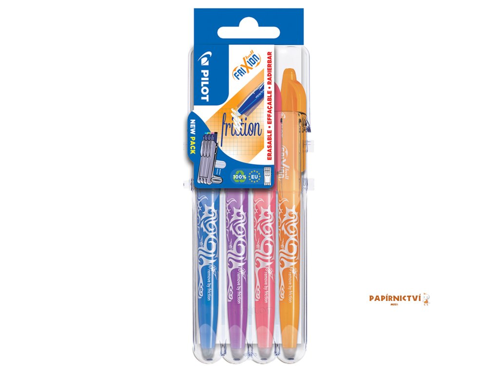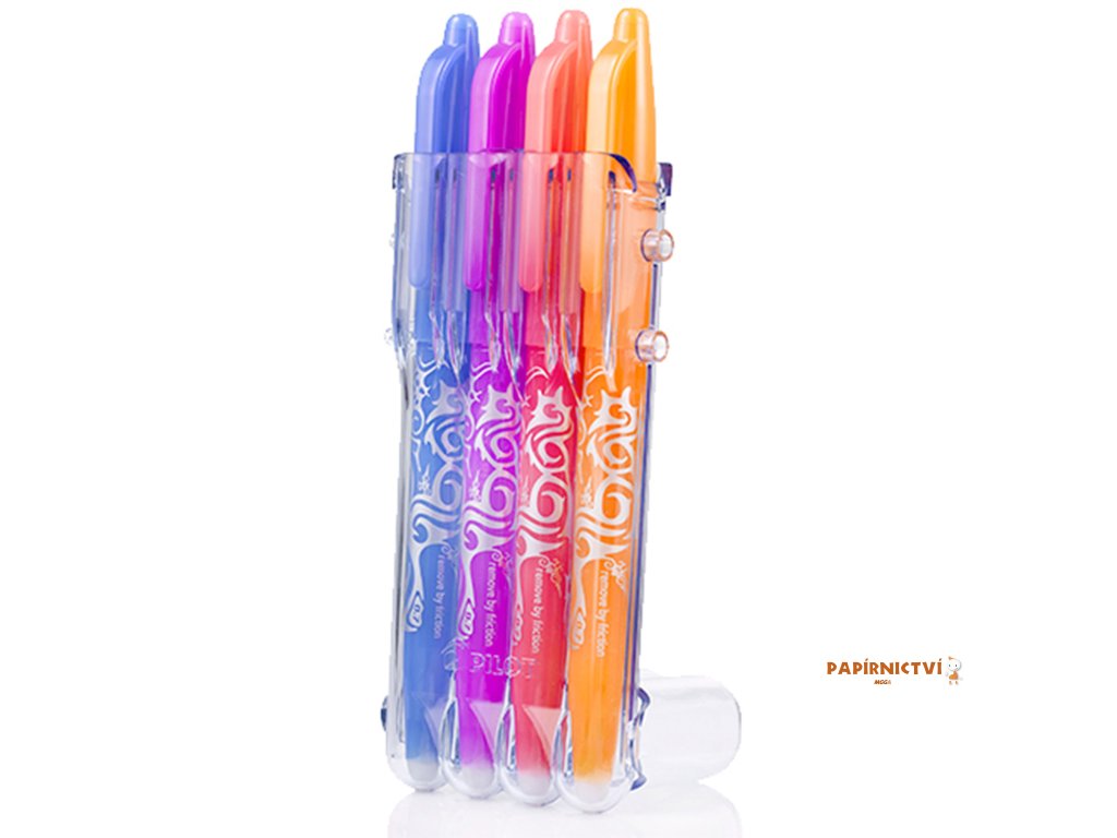 V pouzdru najdeš jeden z bestsellerů Pilot: gumovací pera Pilot FriXion. Napiš, vymaž, přepiš! Už nikdy nemusíš škrtat, když máš gumovací pero Pilot FriXion. Jednoduše napiš, pak vygumuj pomocí gumy v zakončení pera – zahřátím se barva inkoustu změní na transparentní, a pak hned přepiš tím samým perem.