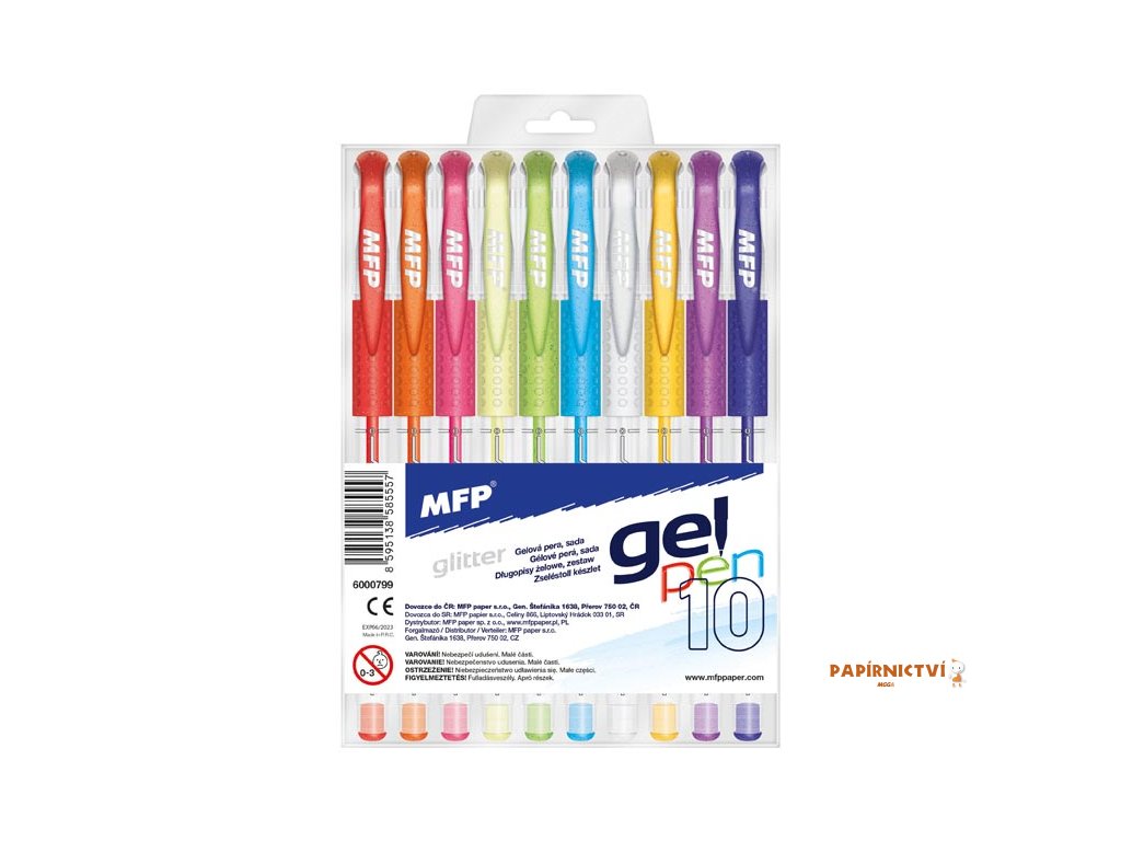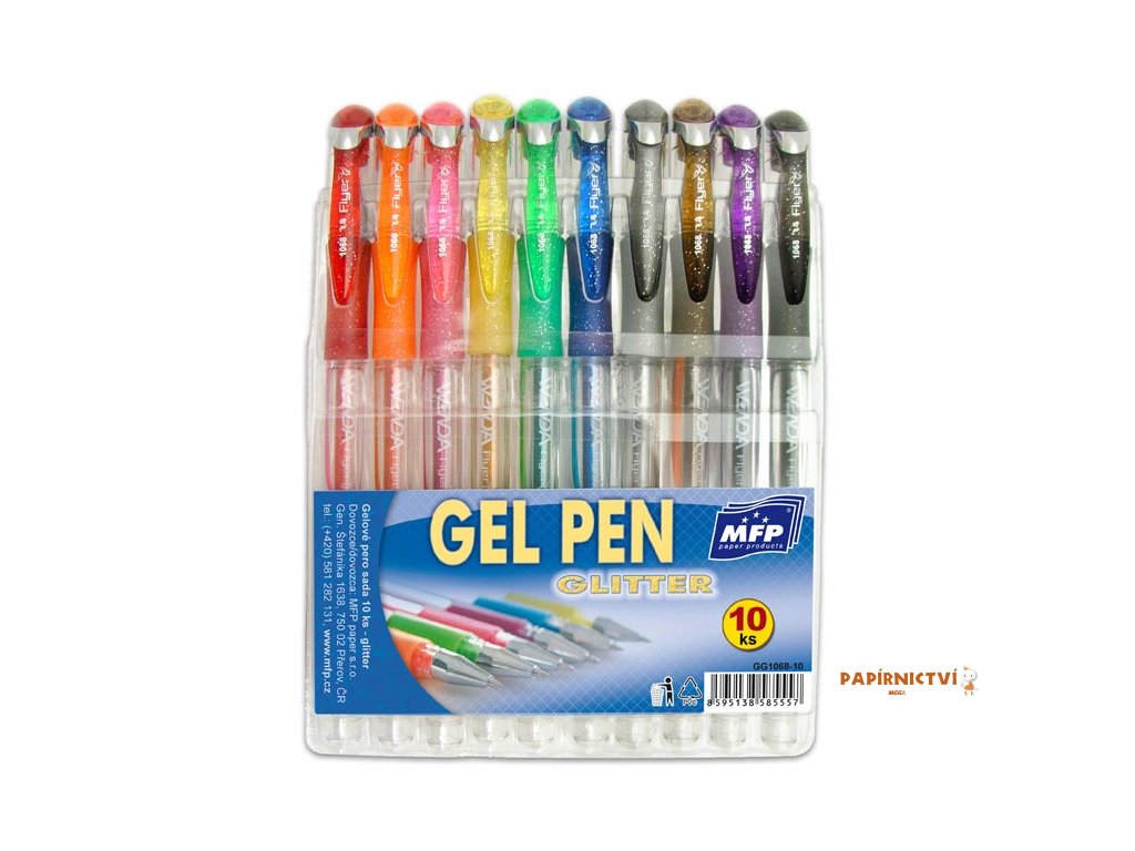 Set 10ks gelových per v GLITTROVÝCH barvách s hrotem 1mm - vhodná pro školní, kancelářské, ale i domácí použití. Gelové pero má pogumovaný úchop, a tak zabraňuje klouzání v ruce.