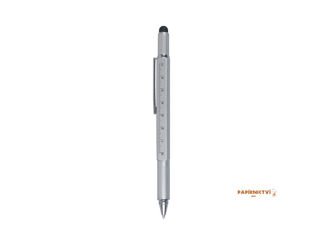 Dárkové pero Grand Slam 5v1 od Gifty je elegantní kovové pero, které v sobě ukrývá pět praktických funkcí. Kromě klasické propisky s jemně píšícím modrým inkoustem nechybí ani šikovný šroubovák, který je důmyslně ukrytý pod dotykovou koncovkou pera. Na těle pera najdete měřítko – z jedné strany v centimetrech, z druhé v palcích (inches). Vestavěná vodováha usnadní kontrolu roviny a měkký stylus se hodí pro pohodlné ovládání dotykových zařízení.