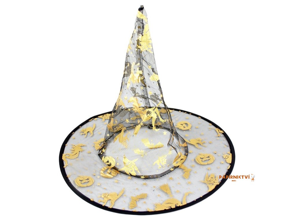 Karnevalový klobouk ozdobený potiskem Halloween. Skvělý doplněk na Halloweenskou oslavu nebo karneval. Klobouk je vyroben z černé síťky a je zdoben zlatými obrázky.