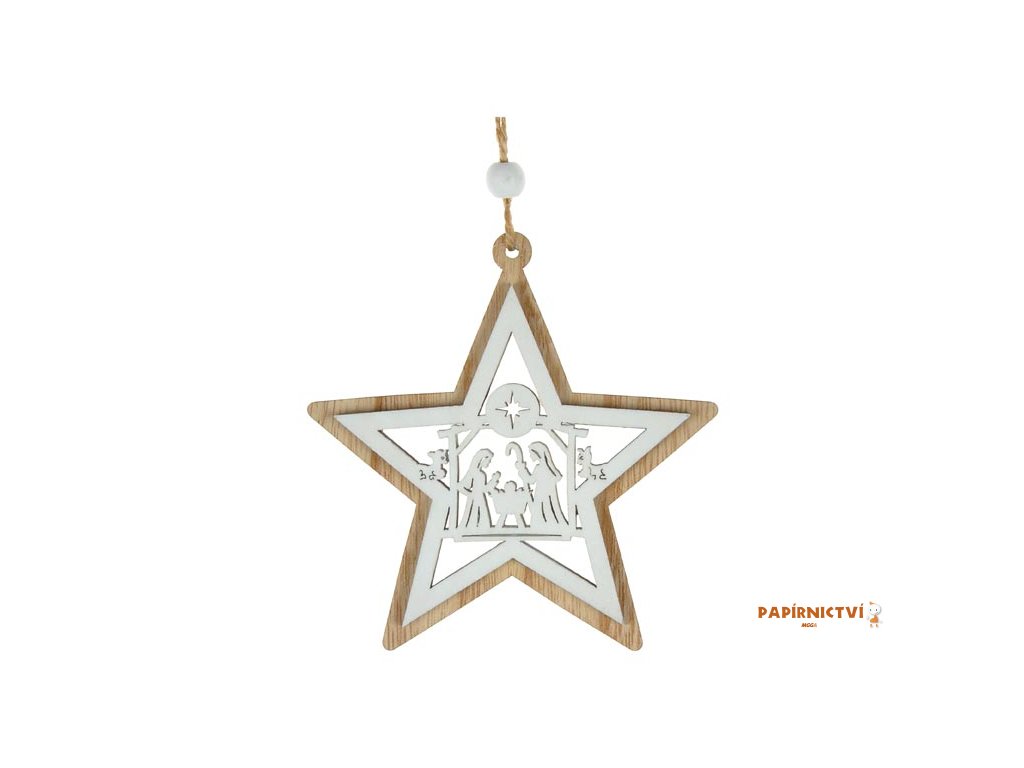 Dřevěná vánoční dekorace ve tvaru hvězdy. Uprostřed hvězdy je vyobrazení Ježíška v kolíbce.Doplňkové parametry