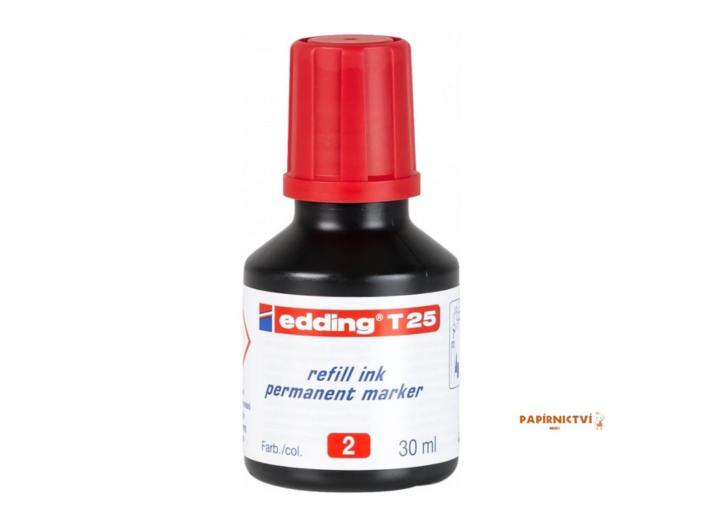 Permanentní inkoust EDDING T25, cervený. Vhodný témer do všech permanentních popisovacu EDDING. Lahvicka obsahuje 30 ml inkoustu. Šetrí náklady na nové popisovace a doplnováním inkoustu se snižuje množství produkovaného odpadu.Doplňkové parametry