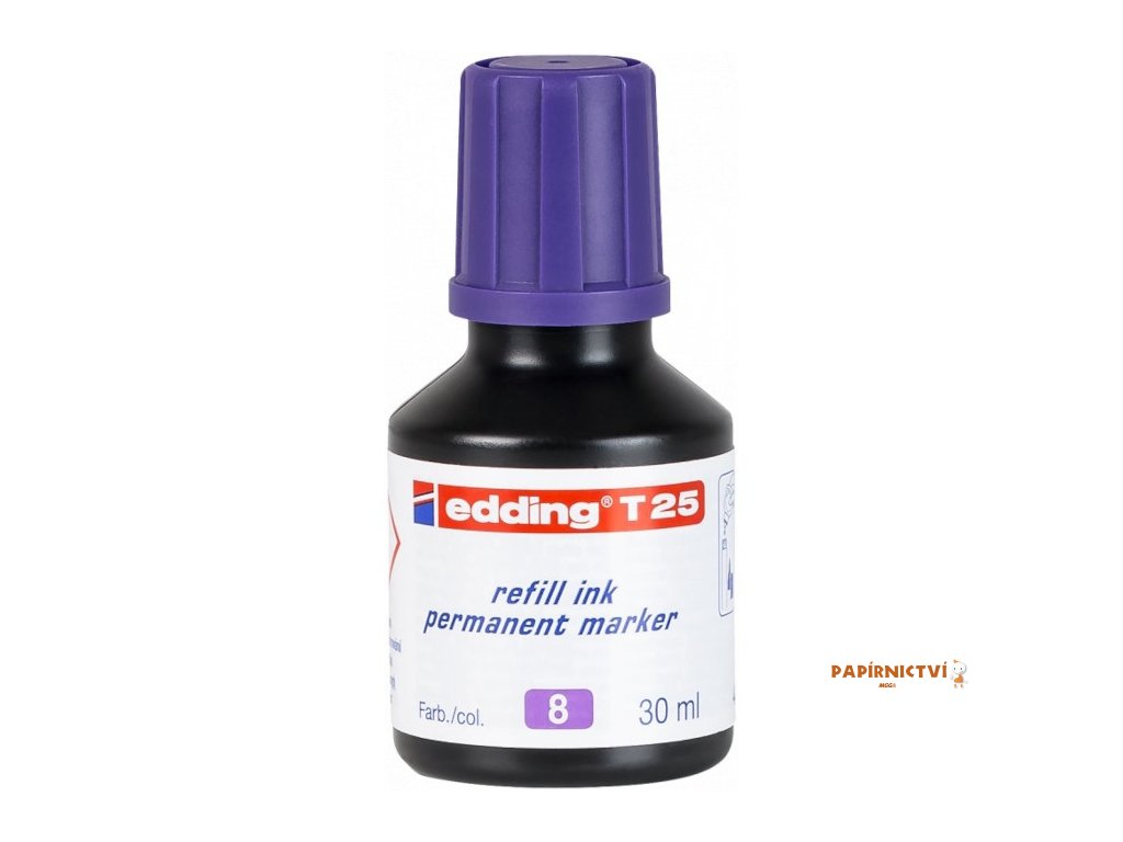 Permanentní inkoust EDDING T25, fialový. Vhodný témer do všech permanentních popisovacu EDDING. Lahvicka obsahuje 30 ml inkoustu. Šetrí náklady na nové popisovace a doplnováním inkoustu se snižuje množství produkovaného odpadu.Doplňkové parametry