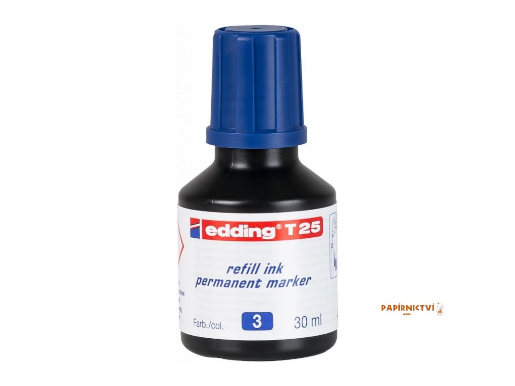 Permanentní inkoust EDDING T25, modrý. Vhodný témer do všech permanentních popisovacu EDDING. Lahvicka obsahuje 30 ml inkoustu. Šetrí náklady na nové popisovace a doplnováním inkoustu se snižuje množství produkovaného odpadu.Doplňkové parametry