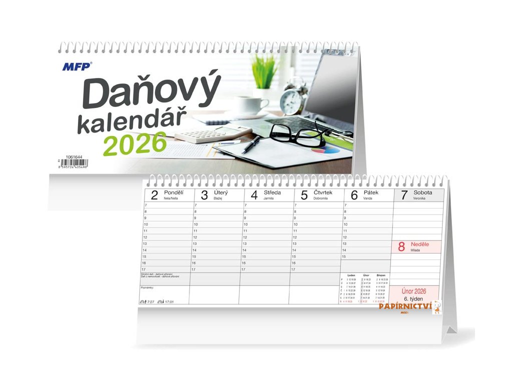 Daňový stolní kalendář na rok 2026. Vhodný pro zapisování důležitých poznámek, k organizování různých událostí každodenního života. Možnost dotisku firemního loga a textu na spodní stranu kalendáře.TYP KALENDÁŘE: stolní