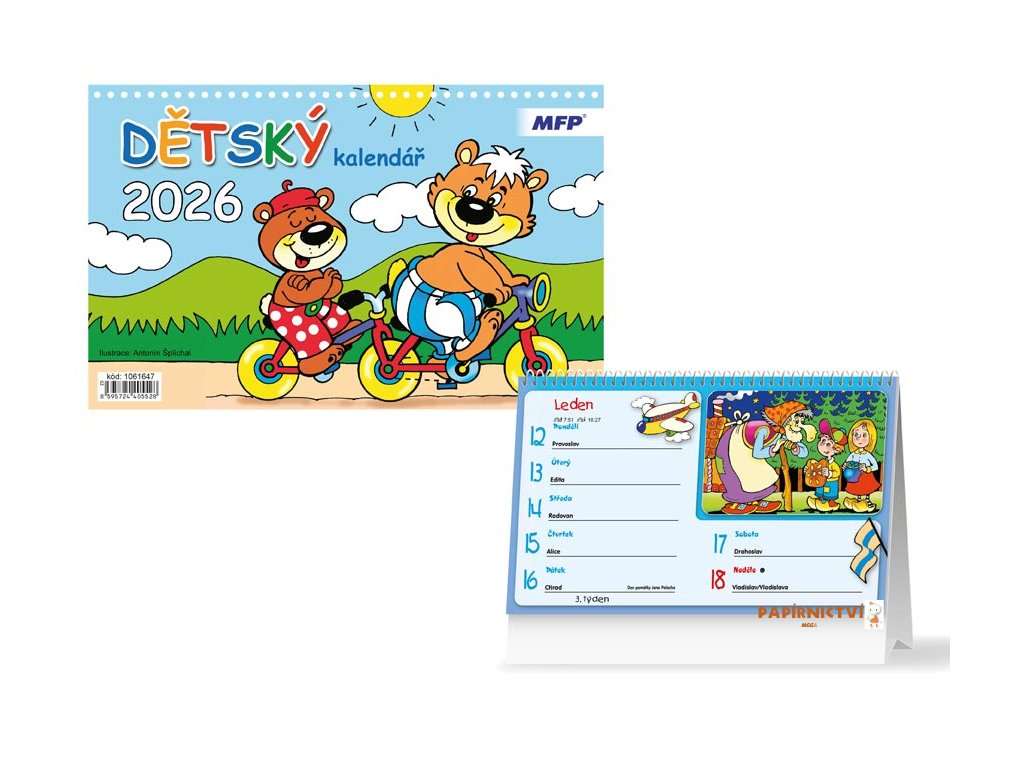 Stolní kalendář na rok 2026 s názvem Dětský. Kalendář je určen pro děti. Na každé stránce kalendáře najdete kreslené barevné obrázky pro děti. Vhodný pro zapisování důležitých poznámek, k organizování různých událostí každodenního života. Možnost dotisku firemního loga a textu na spodní stranu kalendáře.TYP KALENDÁŘE: stolní