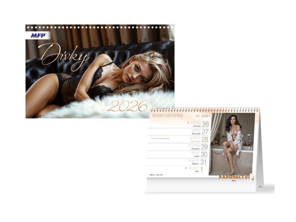 Stolní kalendář na rok 2026 s názvem Dívky. Kalendář je určen především pro pány. Vhodný pro zapisování důležitých poznámek, k organizování různých událostí každodenního života. Možnost dotisku firemního loga a textu na spodní stranu kalendáře.TYP KALENDÁŘE: stolní