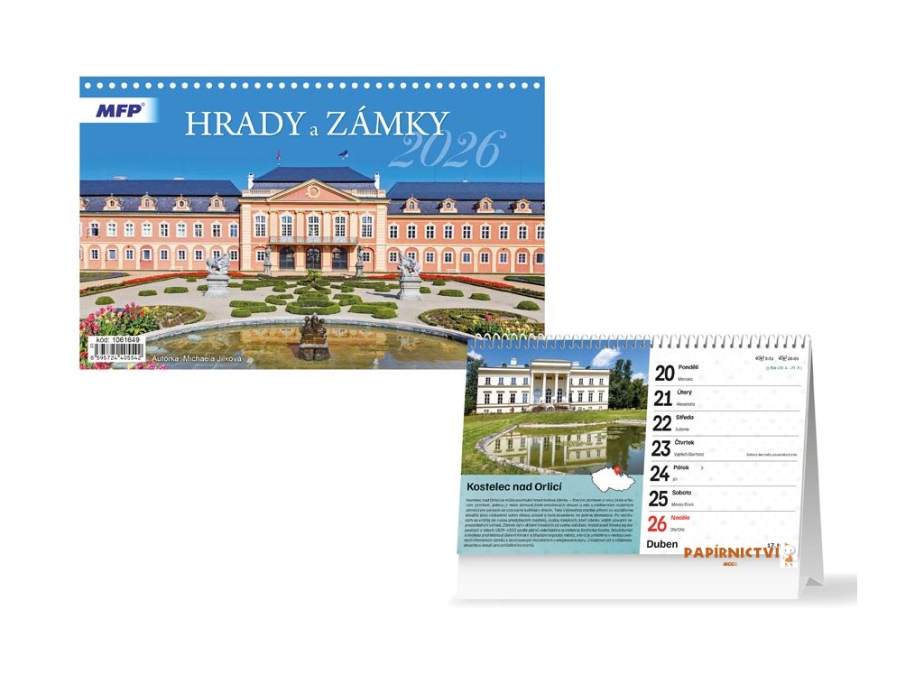 Stolní kalendář na rok 2026 s názvem Hrady a Zámky. Kochejte se fotkami hradů a zámků. Vhodný k organizování různých událostí každodenního života. Možnost dotisku firemního loga a textu na spodní stranu kalendáře.TYP KALENDÁŘE: stolní