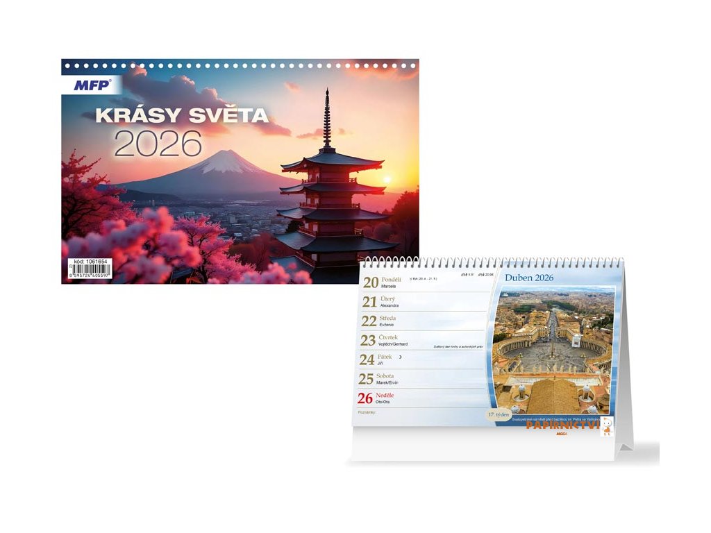 Stolní kalendář na rok 2026 s názvem Krásy světa. Kochejte se fotkami krásných míst z celého světa a inspirujte se, kam na dovolenou. Vhodný k organizování různých událostí každodenního života. Možnost dotisku firemního loga a textu na spodní stranu kalendáře.TYP KALENDÁŘE: stolní