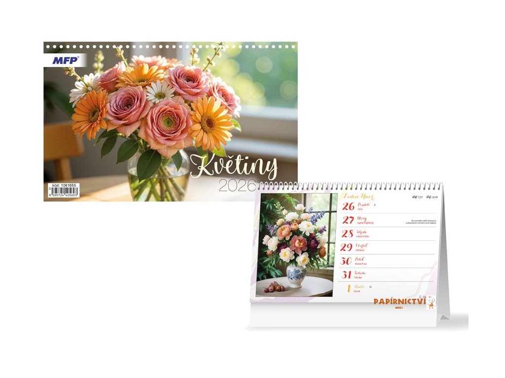 Stolní kalendář na rok 2026 s názvem Květiny. Kochejte se fotkami krásných květinových vazeb a inspirujte se. Vhodný k organizování různých událostí každodenního života. Možnost dotisku firemního loga a textu na spodní stranu kalendáře.TYP KALENDÁŘE: stolní