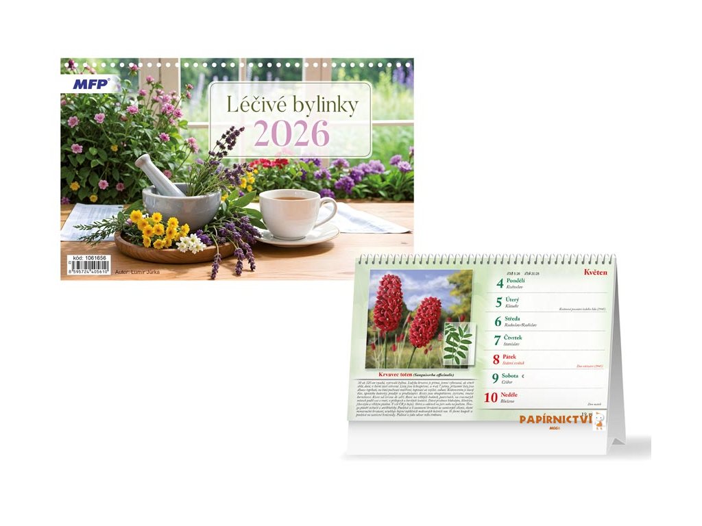 Stolní kalendář na rok 2026 s názvem Léčivé bylinky. Kalendář je určený pro milovníky léčivých bylinek. Každý týden se seznámíte s jednou léčivou bylinkou. Vhodný pro zapisování důležitých poznámek, k organizování různých událostí každodenního života. Možnost dotisku firemního loga a textu na spodní stranu kalendáře.TYP KALENDÁŘE: stolní