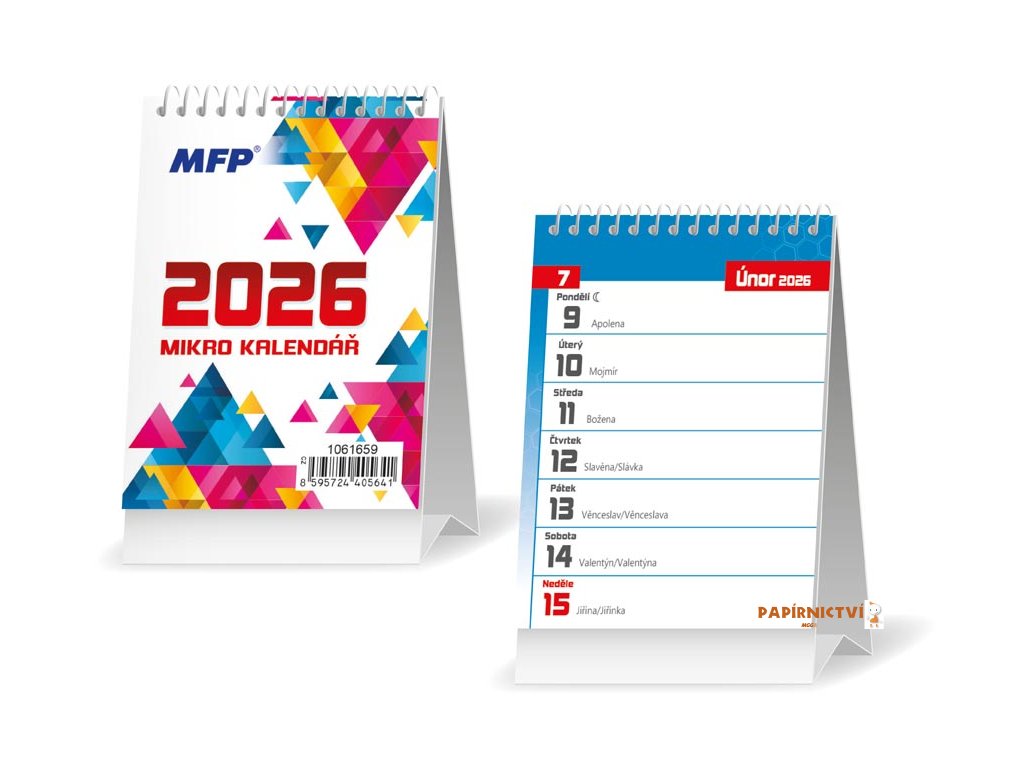 Stolní týdenní kalendář pro rok 2026 s názvem Mikro. Vhodný pro zapisování důležitých poznámek, k organizování různých událostí každodenního života.TYP KALENDÁŘE: stolní