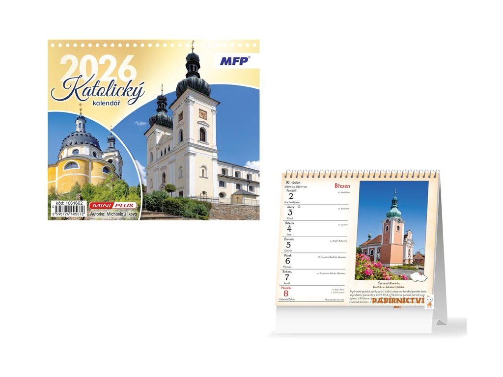 Stolní kalendář na rok 2026 mini s názvem Katolický. Vhodný pro zapisování důležitých poznámek, k organizování různých událostí každodenního života. Najdete zde fotky kostelů, kapliček a poutních míst, které určitě stojí za návštěvu. Pod každým obrázkem je stručná charakteristika místa. Možnost dotisku firemního loga a textu na spodní stranu kalendáře.TYP KALENDÁŘE: stolní