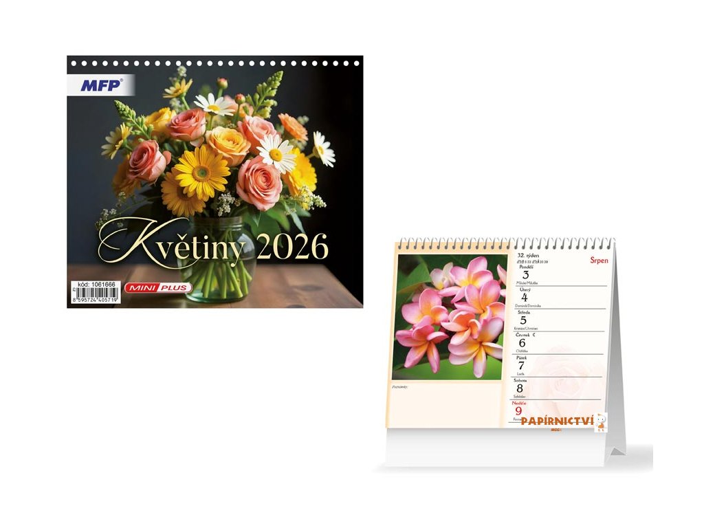 Stolní kalendář na rok 2026 mini s názvem Květiny. Vhodný pro zapisování důležitých poznámek, k organizování různých událostí každodenního života. Možnost dotisku firemního loga a textu na spodní stranu kalendáře.TYP KALENDÁŘE: stolní