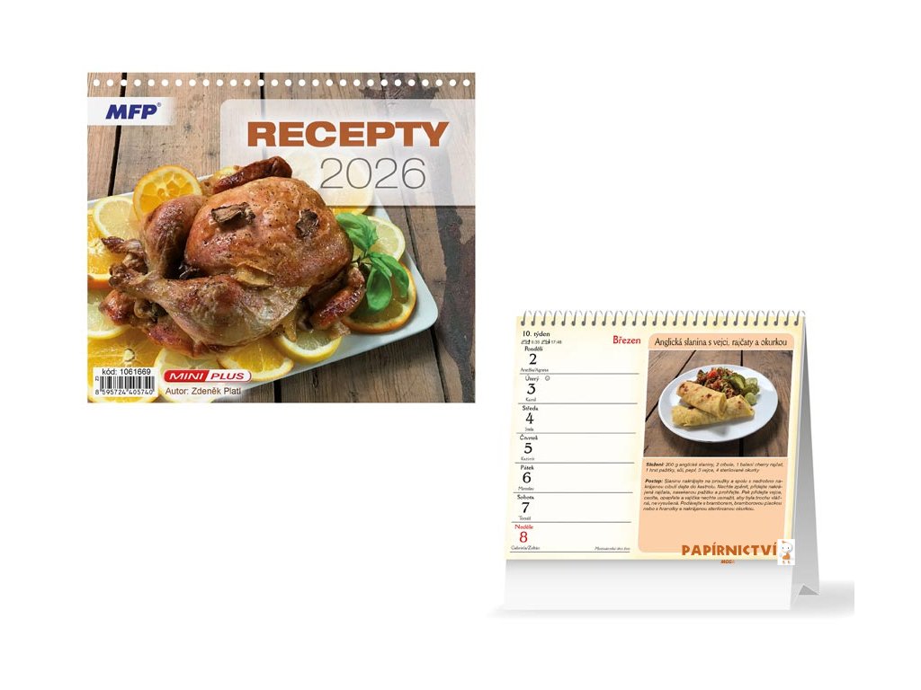 Stolní kalendář na rok 2026 mini s názvem Recepty. Vhodný pro zapisování důležitých poznámek, k organizování různých událostí každodenního života. Najdete zde fotky a recepty jídel, které jsou lehké na přípravu. Pořiďte si kalendář, který je ideální pro milovníky dobrého jídla a kuchyně. Inspirujte se a připravte si chutný nedělní oběd. Možnost dotisku firemního loga a textu na spodní stranu kalendáře.TYP KALENDÁŘE: stolní
