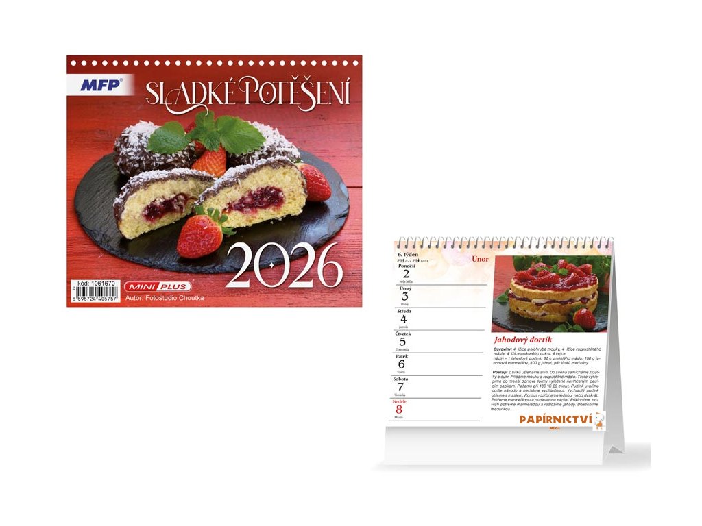 Stolní kalendář na rok 2026 mini s názvem Sladké potěšení. Vhodný pro zapisování důležitých poznámek, k organizování různých událostí každodenního života. Milovníci sladkých dezertů, zákusků a pohárů si příjdou na své. Najdete zde fotky a recepty dezertů, které jsou chutné a zvládne je každý. „Honí Vás mlsná?“ Oslaďte si život, inspirujte se z řady receptů a upečte si lahodný dezert. Pod každou fotkou je postup receptu. Možnost dotisku firemního loga a textu na spodní stranu kalendáře.TYP KALENDÁŘE: stolní