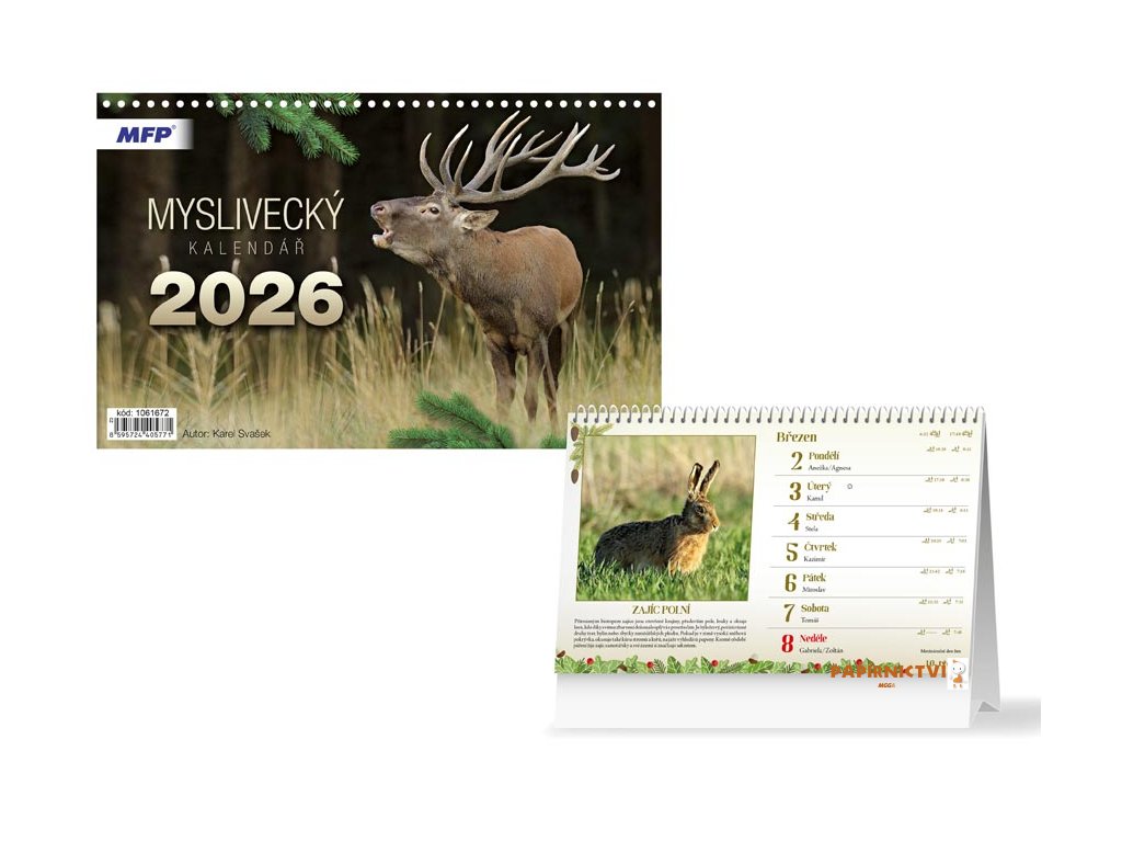 Stolní kalendář na rok 2026 s názvem Myslivecký. Kalendář je vhodný pro myslivce nebo milovníky přírody. Najdete zde fotky divokých zvířat a povídání o nich. Vhodný pro zapisování důležitých poznámek, k organizování různých událostí každodenního života. Možnost dotisku firemního loga a textu na spodní stranu kalendáře.TYP KALENDÁŘE: stolní