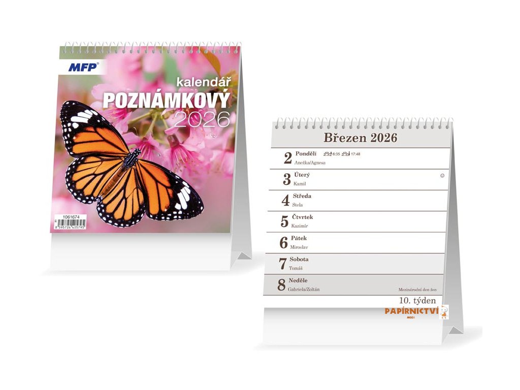 Stolní kalendář na rok 2026 s názvem Poznámkový. Vhodný pro zapisování důležitých poznámek, k organizování různých událostí každodenního života. Možnost dotisku firemního loga a textu na spodní stranu kalendáře.TYP KALENDÁŘE: stolní
