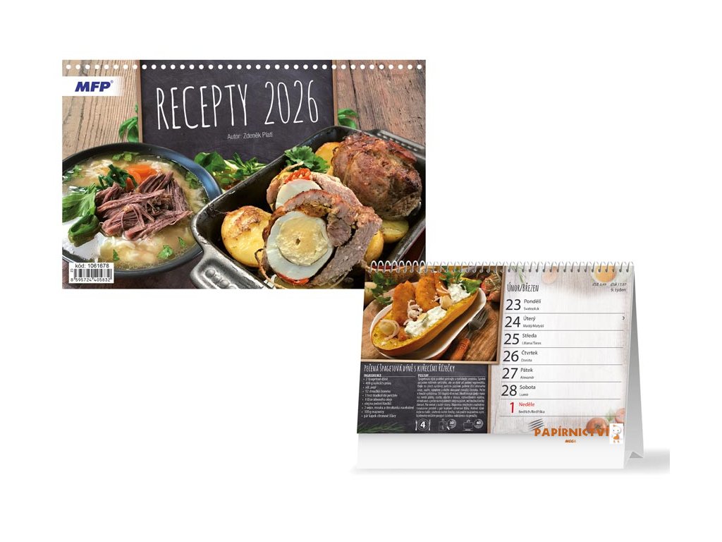Stolní kalendář na rok 2026 s názvem Recepty. Každý týden Vás potěší jeden recept na chutný pokrm. Vhodný na zapisování důležitých poznámek, k organizování různých událostí každodenního života. Možnost dotisku firemního loga a textu na spodní stranu kalendáře.TYP KALENDÁŘE: stolní