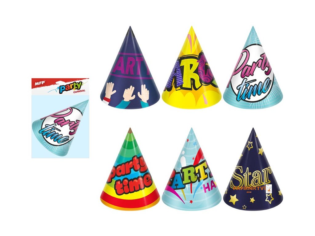 - 6 ks barevných kloboučků s různými párty motivy