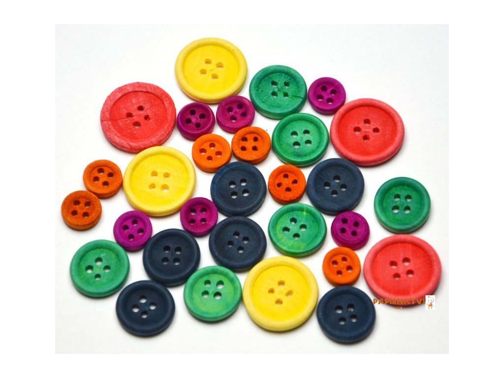Knoflíky dřevěné, 30 ks - průměr 2,2; 1,7; 1,1 cm. Velké knoflíky (2,2 cm) mají barvu žlutou a růžovou - po 3 ks, střední knoflíky (1,7 cm) mají barvu modrou a zelenou - po 6 ks, malé knoflíky (1,1 cm) mají barvu vínovou a oranžovou - po 6 ks.