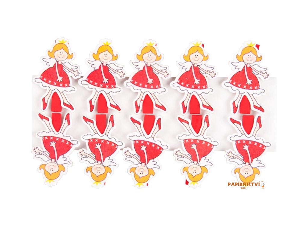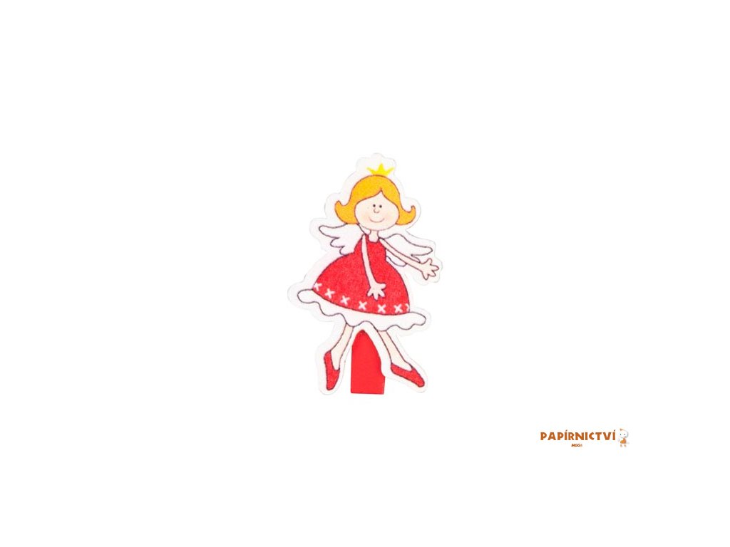 Vánoční, dřevěná dekorace andělka nalepená na červeném kolíčku, ozdobí váš vánoční dárek, přáníčka nebo je můžete kamkoliv jinam připnout a ozdobit tak váš interiér. Vyrobeno z překližky.BALENÍ OBSAHUJE: