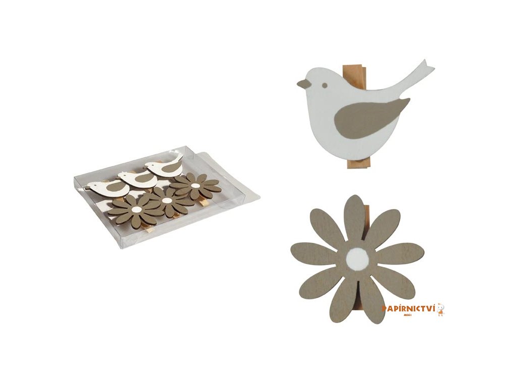 Kolíčky pták+kytka 6ks/3,5-4,5cm dřevo 2221610