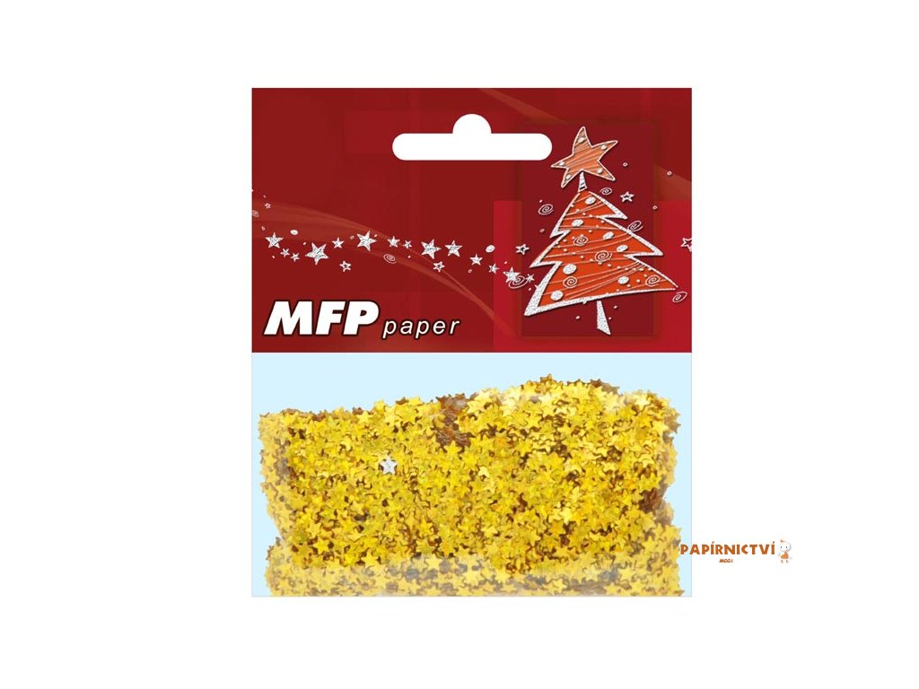 Vánoční dekorace, zlaté konfety ve tvaru hvězdy. Konfety jsou ve zlaté metalické barvě - vhodné pro dekorování stolů, nebo pro výrobu vánočních dekorací.Hmotnost: 20g
