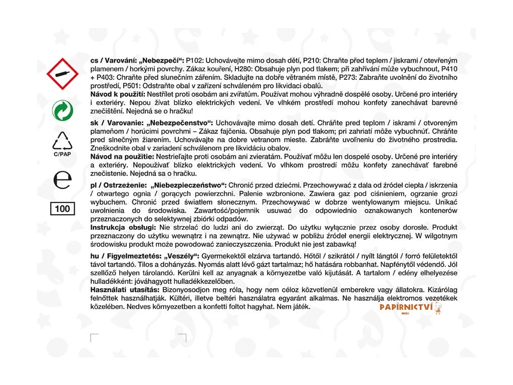 Nestřílet proti osobám ani zvířatům. Používat mohou výhradně dospělé osoby. Určené pro interiéry i exteriéry. Nepoužívat blízko elektrických vedení. Ve vlhkém prostředí mohou konfety zanechávat barevné znečištění. Nejedná se o hračku!
