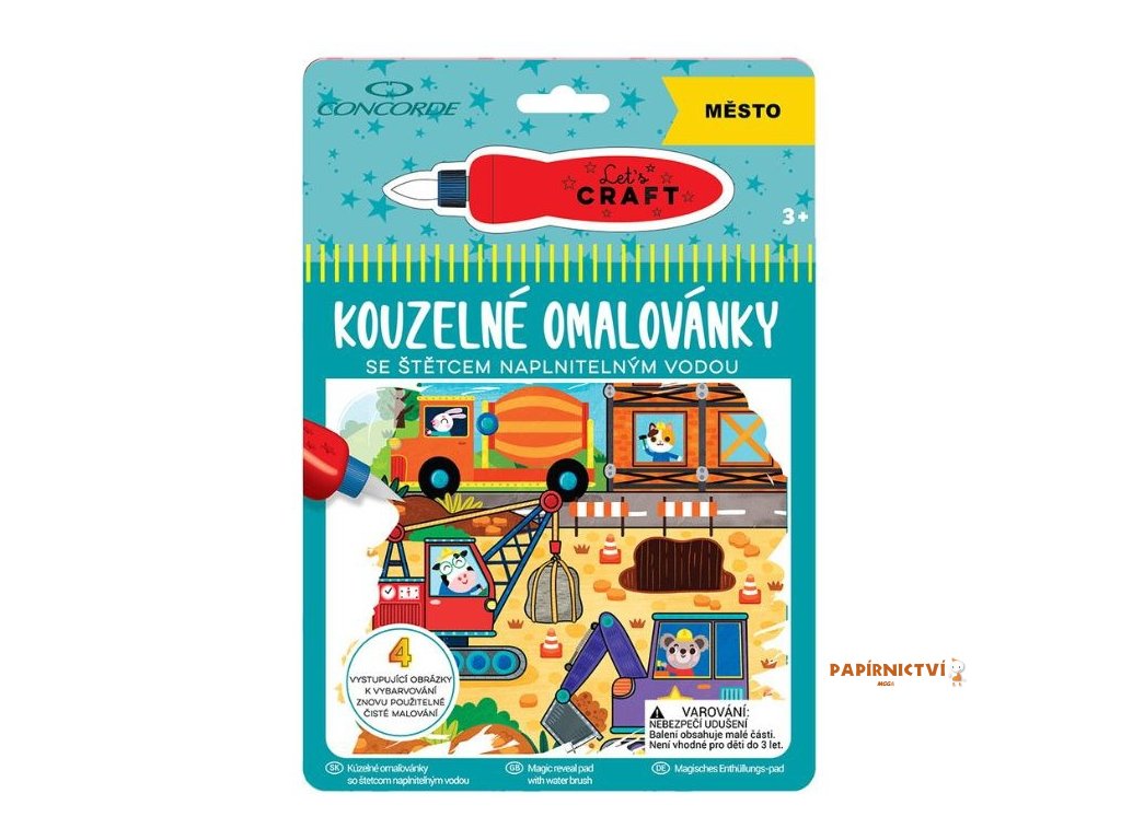Kouzelné omalovánky disponují čtyřmi obrázky. Štětec se naplní vodou a po rozetření vody na bílou plochu obrázky získají barvu. Po vybarvení se omalovánky nechají uschnout a po úplném uschnutí jsou znovu použitelné. Balení obsahuje: 4 znovupoužitelné obrázkové plochy z tvrdého kartonu a speciální vodou plnitelný štětec.