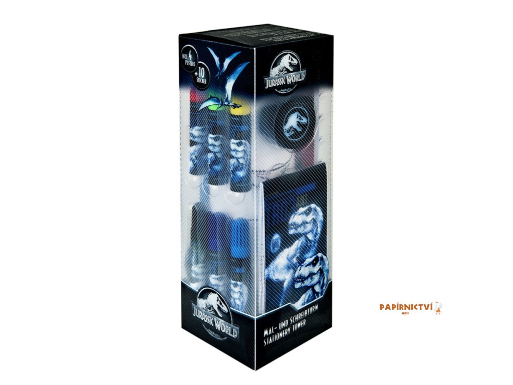 Kreativní sada s motivem Jurassic World obsahuje 10 mini barevných tužek, 6 fixů, tužku, pravítko, gumu, ořezávátko, poznámkový blok, 4 plakáty a 10 nálepek.