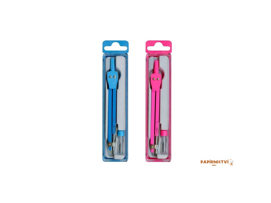Rýsovací souprava - kružítko + náhradní tuha (v růžovém a modrém provedení). Univerzální kružítko pro kružnice do průměru 42cm. Možnost nastavení úhlu hrotu a tuhy kružítka. Kružítko je uloženo v plastovém pouzdru.Délka kružítka: 14 cm
