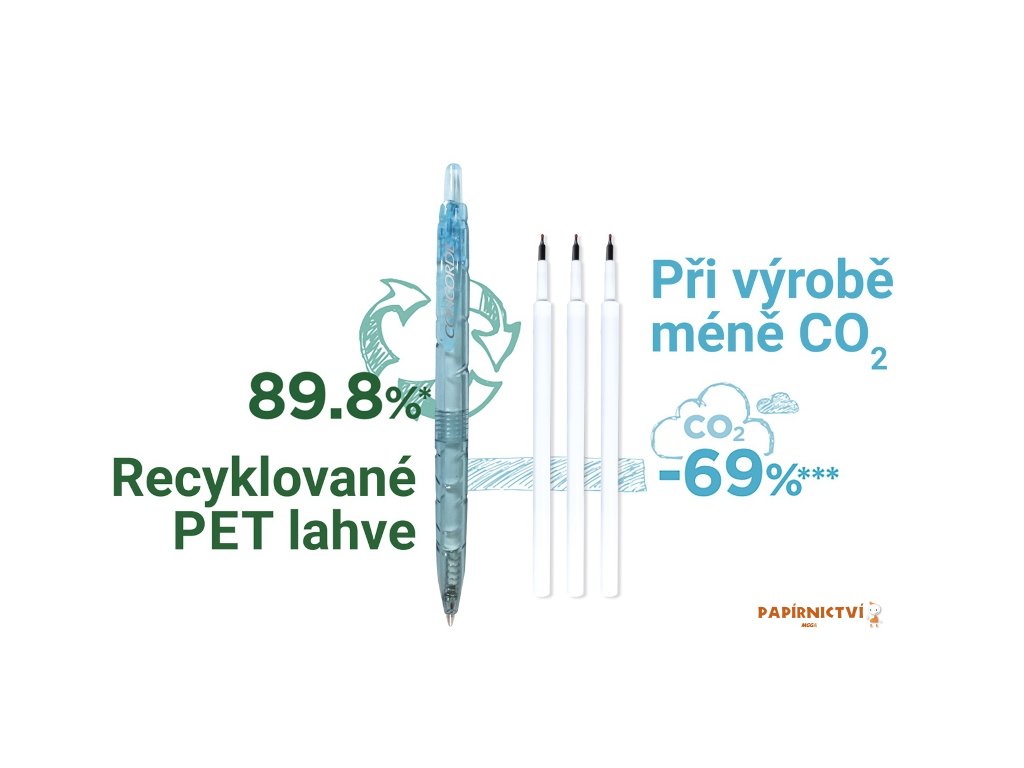 Vyrobeno z recyklovaného materiálu, z 89,8 % plastových lahví, z nichž 2,5 % tvorí oceánské plasty. Plastové materiály jsou získávány nejen z oceánu, ale také z rek, což prispívá k ochrane životního prostredí. Pri výrobe pera dochází k redukci oxidu uhlicitého až o 69 % a díky tomu se snižuje uhlíková stopa ve srovnání s výrobou per bez použití recyklovaných plastu. Behem životního cyklu jednoho pera (od výroby až po jeho spotrebu) a trem výmenám náplne dojde k celkovému snížení ekologického dopadu približne o 20 % ve srovnání s nákupem trí nových per. Inkoust na olejové bázi, což umožnuje nejen hladké a lehké psaní, ale také rychlé zasychání. Uvnitr hlavy pera je inovativní tesnící mechanismus v podobe malé pružinky, která zabranuje úniku inkoustu a jeho zasychání. Hrot o šírce 0,5 mm. Hrot pera je kombinací klasického a jehlového hrotu, pricemž využívá výhod obou zmínených.Doplňkové parametry