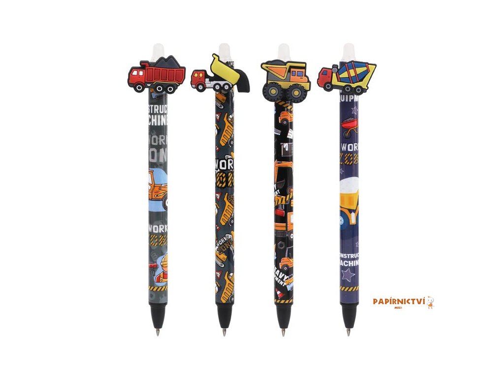 Gumovací kuličkové pero s motivy pracovních aut obsahuje speciální inkoust tzv. vymaž a přepiš, nebo vymaž a nech znovu objevit. Pokud uděláte chybu, stačí jen otočit pero a plastovou špičkou text vymažete. Špička zahřeje inkoust, ten zmizí a lze je znovu přepsat. Můžete si psát i tajné vzkazy, po vygumování stačí jen papír ochladit pod bod mrazu a text se znovu objeví.Přečtěte si, na jakém principu funguje gumovací pero Wizard!