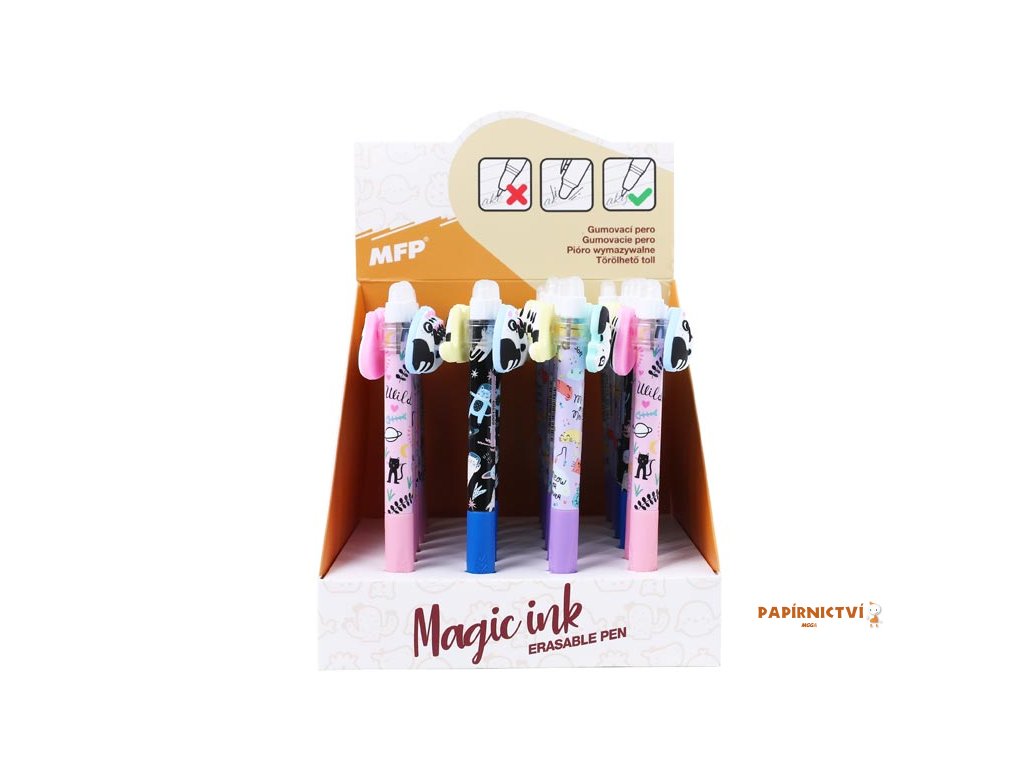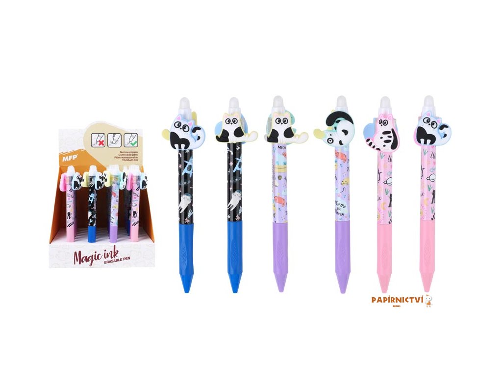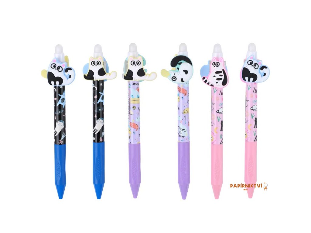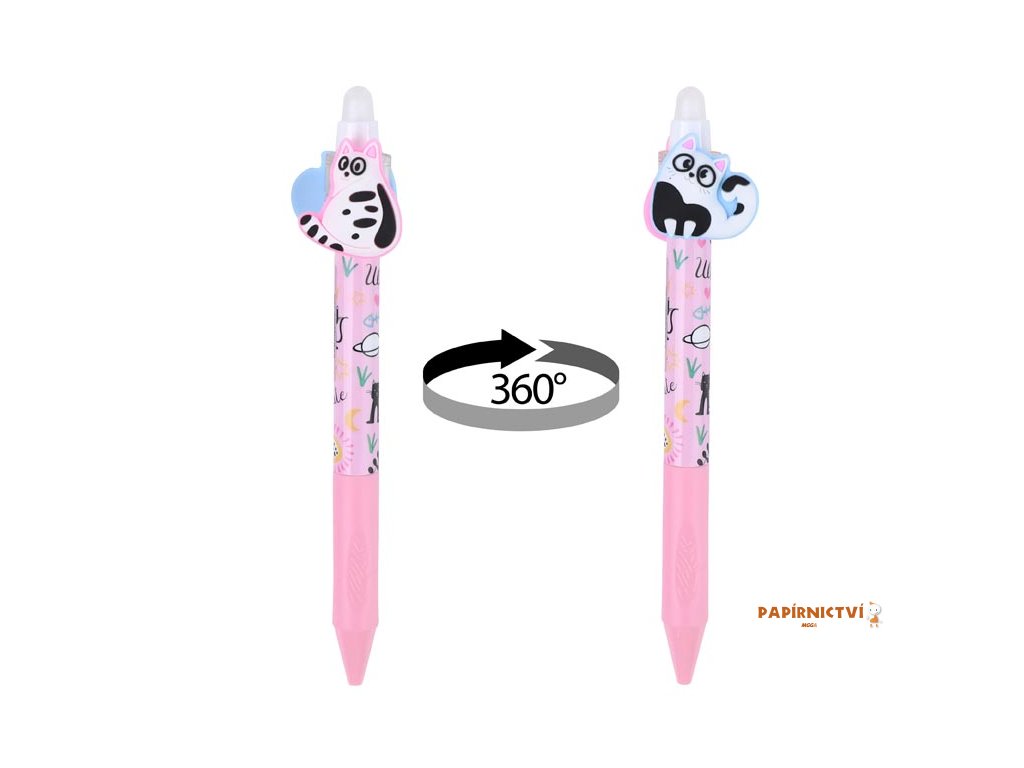 Gumovací kuličkové pero s motivem koček je perfektní volbou pro všechny milovníky těchto roztomilých zvířátek. Pero má jemný hrot o tloušťce 0,5 mm, který zajišťuje přesné a hladké psaní. Speciální inkoust lze jednoduše vymazat pomocí integrované gumy, takže opravy chyb jsou snadné a pohodlné. Jedinečným prvkem jsou pohyblivé figurky koček umístěné v horní části pera, které se mohou otáčet. Je ideální pro školní použití, úkoly nebo kreativní psaní, kde oceníte nejen funkčnost, ale i originální design.Přečtěte si, na jakém principu funguje gumovací pero Wizard!