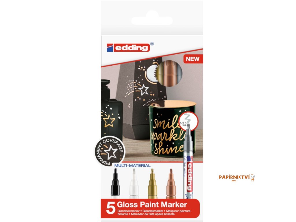 Kaligrafický popisovac EDDING 753 sada 5 ks v metalických barvách je urcen pro permanentní ozdobné psaní a zdobení na hladkých, pruhledných i tmavých materiálech, napr. na skle, kovu, plastu a krídovém papíru. Má brilantní vysoce lesklé trpytivé metalické barvy. Barevný pigmentový inkoust je rychleschnoucí, extrémne odolný vuci svetlu a odolný vuci rozmazání, opotrebení a povetrnostním vlivum. Ventilový systém umožnuje rovnomerný tok inkoustu pro dokonalé pokrytí a nepruhlednost barvy. Je vybaven speciálním kaligrafickým hrotem, s nímž je možné tvorit od jemných až po široké tahy, s šírkou stopy v rozsahu od 1 do 2,5 mm. Snadné a cisté použití pro spontánní kreativu.Doplňkové parametry