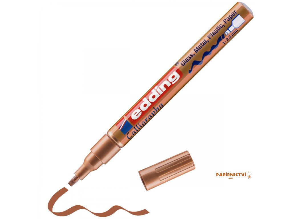 Kaligrafický popisovac Edding 753 je urcen pro permanentní ozdobné psaní a zdobení na hladkých, pruhledných i tmavých materiálech, napr. na skle, kovu, plastu a krídovém papíru. Má brilantní vysoce lesklé trpytivé metalické barvy. Barevný pigmentový inkoust je rychleschnoucí, extrémne odolný vuci svetlu a odolný vuci rozmazání, opotrebení a povetrnostním vlivum. Ventilový systém umožnuje rovnomerný tok inkoustu pro dokonalé pokrytí a nepruhlednost barvy. Je vybaven speciálním kaligrafickým hrotem, s nímž je možné tvorit od jemných až po široké tahy, s šírkou stopy v rozsahu od 1 do 2,5 mm. Snadné a cisté použití pro spontánní kreativu.Doplňkové parametry