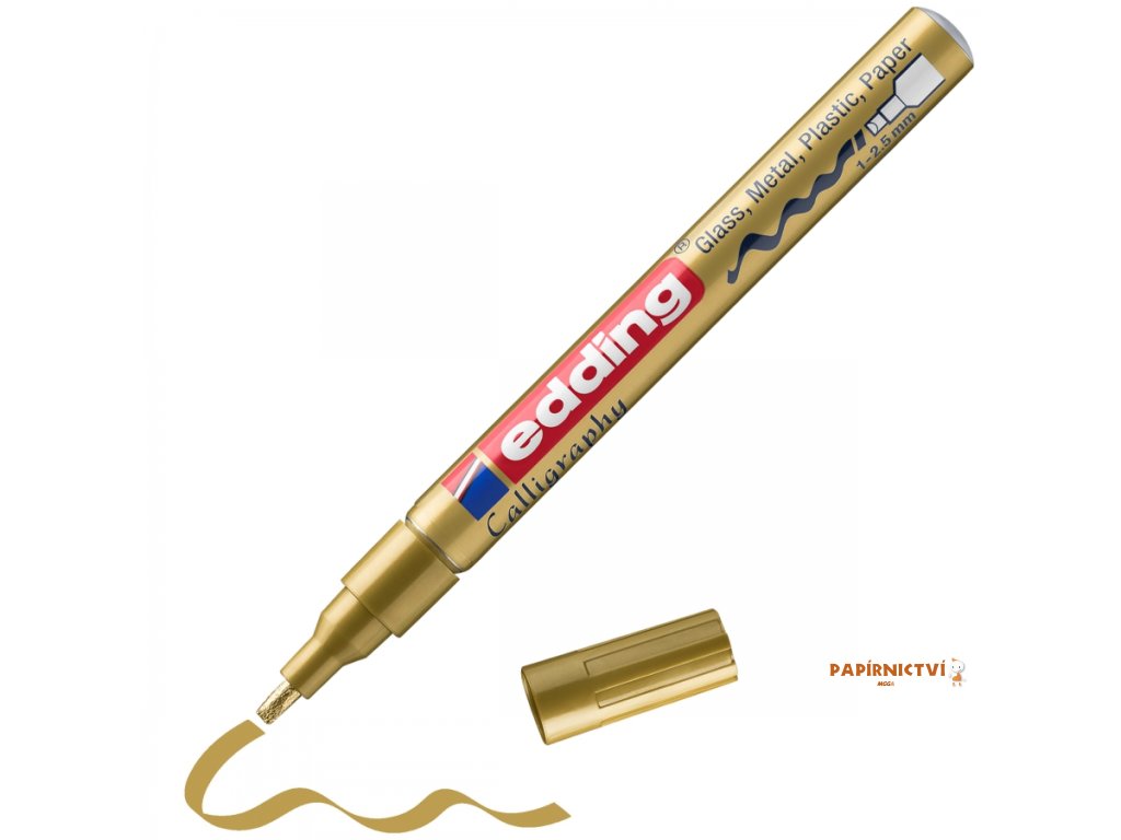 Kaligrafický popisovac Edding 753 je urcen pro permanentní ozdobné psaní a zdobení na hladkých, pruhledných i tmavých materiálech, napr. na skle, kovu, plastu a krídovém papíru. Má brilantní vysoce lesklé trpytivé metalické barvy. Barevný pigmentový inkoust je rychleschnoucí, extrémne odolný vuci svetlu a odolný vuci rozmazání, opotrebení a povetrnostním vlivum. Ventilový systém umožnuje rovnomerný tok inkoustu pro dokonalé pokrytí a nepruhlednost barvy. Je vybaven speciálním kaligrafickým hrotem, s nímž je možné tvorit od jemných až po široké tahy, s šírkou stopy v rozsahu od 1 do 2,5 mm. Snadné a cisté použití pro spontánní kreativu.Doplňkové parametry