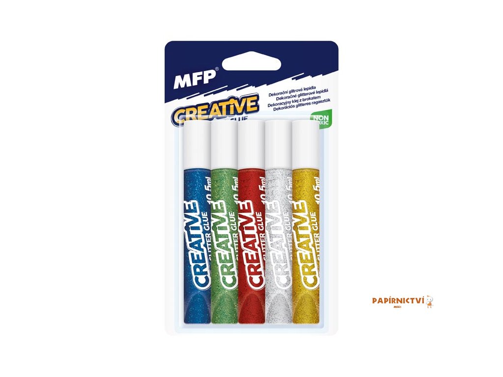 - 5 glitrových lepidel (modrá, zelená, červená, stříbrná, zlatá)