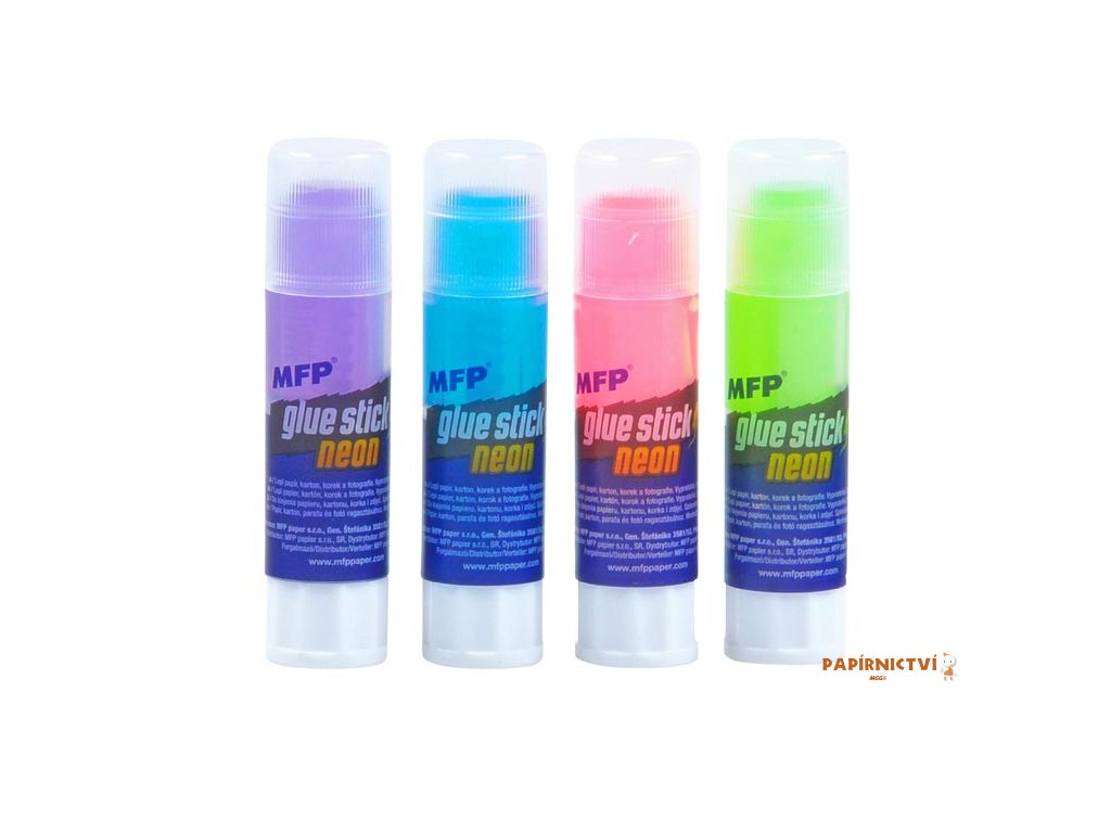 Tuhé lepidlo (lepící tyčinka) na papír v neonových barvách. Lepí papír, karton, fotografie, korek. Univerzální použití v kanceláři, doma i ve škole. Díky neonové barvě v lepidle lépe poznáte kde máte lepidlo nanesené a kde ne.Lepidlo se vysouvá z plastového pouzdra pootočením spodního dílu. Lepidlo je snadno vypratelné a omyvatelné vlažnou vodou. Neobsahuje toxické a škodlivé látky.