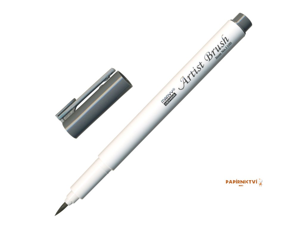 barva zmavě šedá • popisovač Marvy 1100 Artist Brush se štětcovým hrotem je rozmývatelný vodou • obsahuje barevný inkoust na vodní bázi • vhodný na vybarvování obrázků, otisků razítek (natištěných permanentním inkoustem), ilustrace • flexibilní štětcový hrot umožňuje vytvářet tenké i tlusté linky • barvy lze vzájemně propojovat • netoxický, bez kyseliny