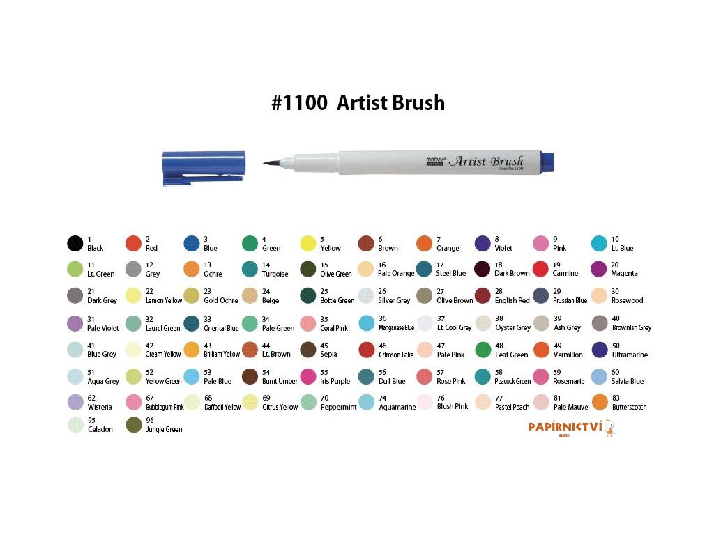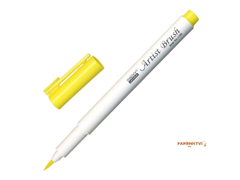 barva citronově žlutá • popisovač Marvy 1100 Artist Brush se štětcovým hrotem je rozmývatelný vodou • obsahuje barevný inkoust na vodní bázi • vhodný na vybarvování obrázků, otisků razítek (natištěných permanentním inkoustem), ilustrace • flexibilní štětcový hrot umožňuje vytvářet tenké i tlusté linky • barvy lze vzájemně propojovat • netoxický, bez kyseliny