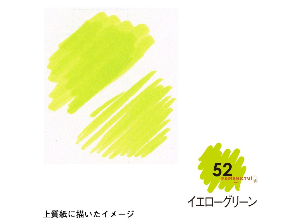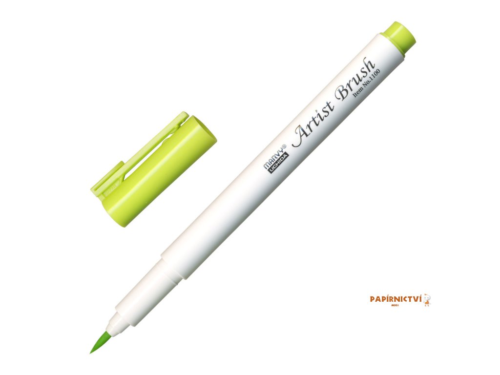 barva žluto-zelená • popisovač Marvy 1100 Artist Brush se štětcovým hrotem je rozmývatelný vodou • obsahuje barevný inkoust na vodní bázi • vhodný na vybarvování obrázků, otisků razítek (natištěných permanentním inkoustem), ilustrace • flexibilní štětcový hrot umožňuje vytvářet tenké i tlusté linky • barvy lze vzájemně propojovat • netoxický, bez kyseliny