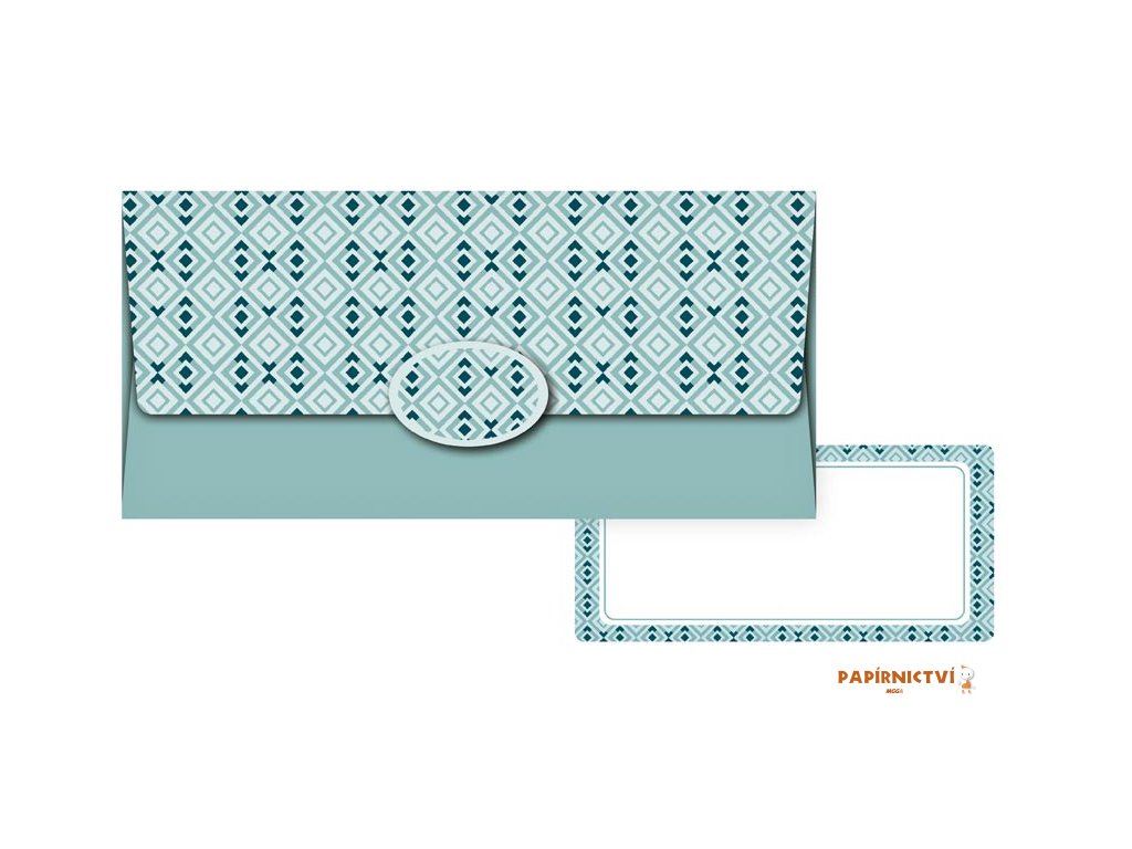 Obálka na peníze v odstínech modré a tyrkysové s elegantním geometrickým vzorem. Ideální pro stylové darování finančního obnosu na různé příležitosti, jako jsou svatby, narozeniny, výročí nebo jiné oslavy. Součástí obálky je kartička pro případný vzkaz, přání či osobní věnování. Uzávěr na přední straně zajišťuje bezpečné uchování obsahu.
