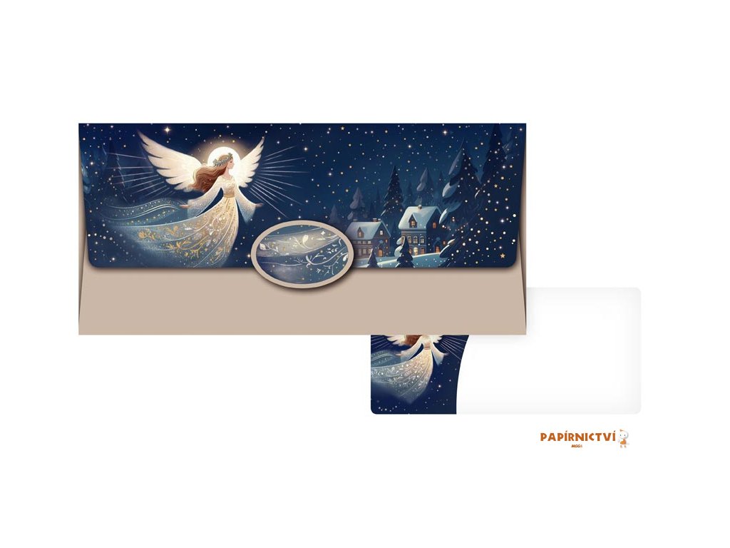 Vánoční obálka na peníze s andělemHledáte způsob, jak předat peníze nebo poukaz stylově a s vánoční atmosférou? Tato luxusní obálka na peníze s motivem anděla je ideální volbou pro slavnostní chvíle. Elegantní ilustrace anděla v zářivých šatech, zasněžená vesnička a noční obloha plná hvězd vytvářejí dojem kouzelného vánočního příběhu.