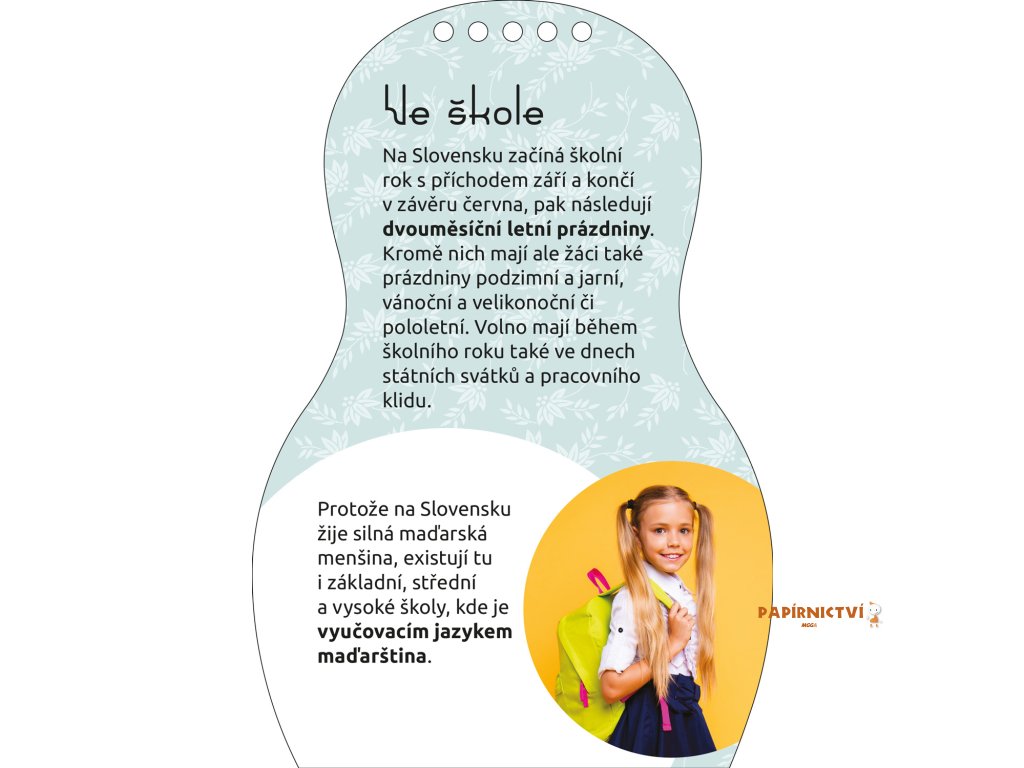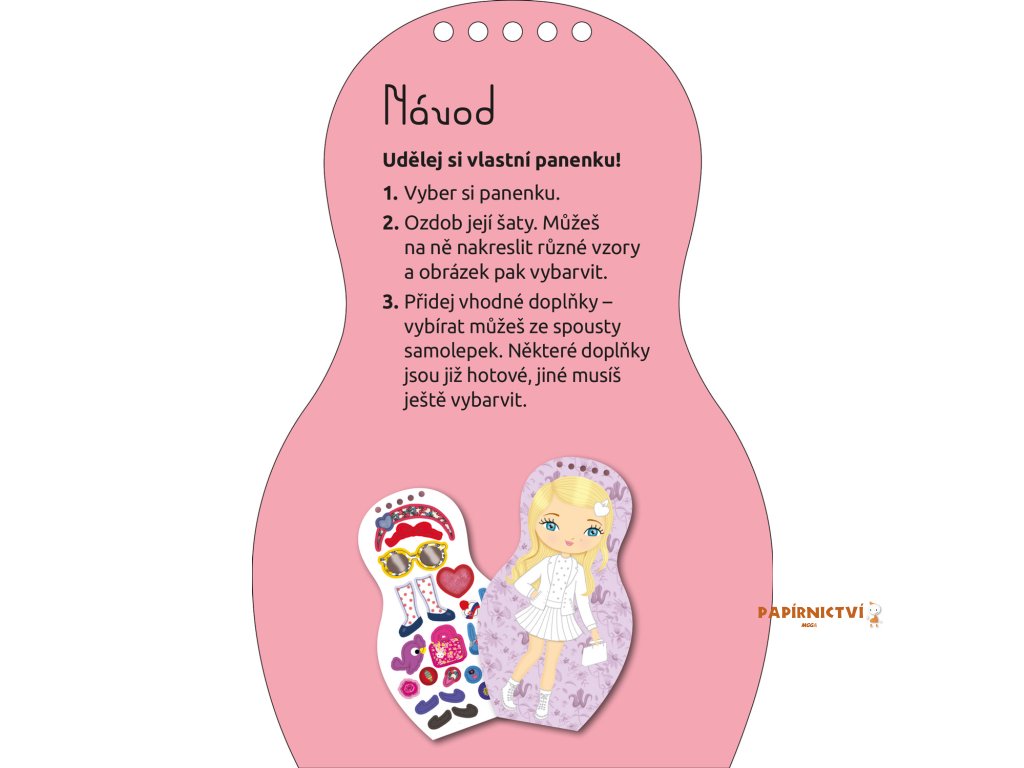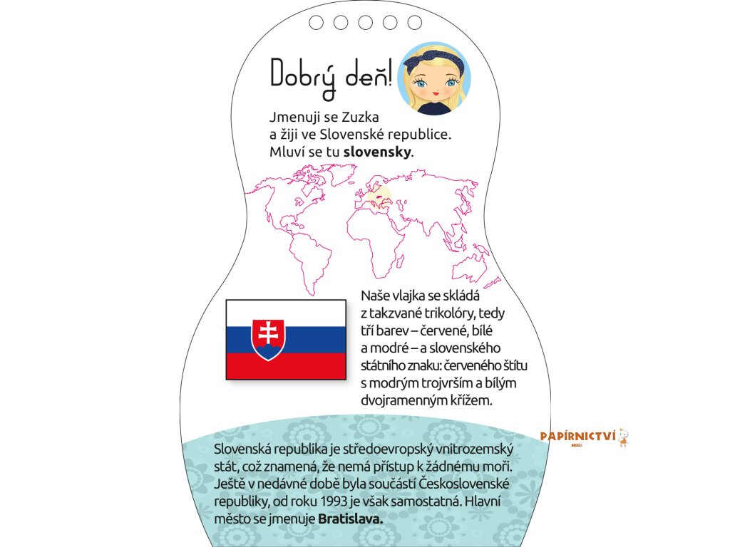 Kreativní omalovánky, vzory a samolepky – tato knížka obsahuje vše, co je třeba k vytvoření nesčetných modelů podle slovenské módy. Tradicemi inspirované náměty podněcují fantazii, a k tomu se děti dozvědí i spoustu zajímavých informací navrch! Jak jejich vrstevníci ze země, která byla dlouho součástí té naší, mluví, bydlí, jak se učí a baví, jak se oblékají a na jakých specialitách si pochutnávají? Panenka Zuzka provede malé čtenáře po své vlasti a představí též slovenské zvláštnosti, tradice, kulturu a módu.